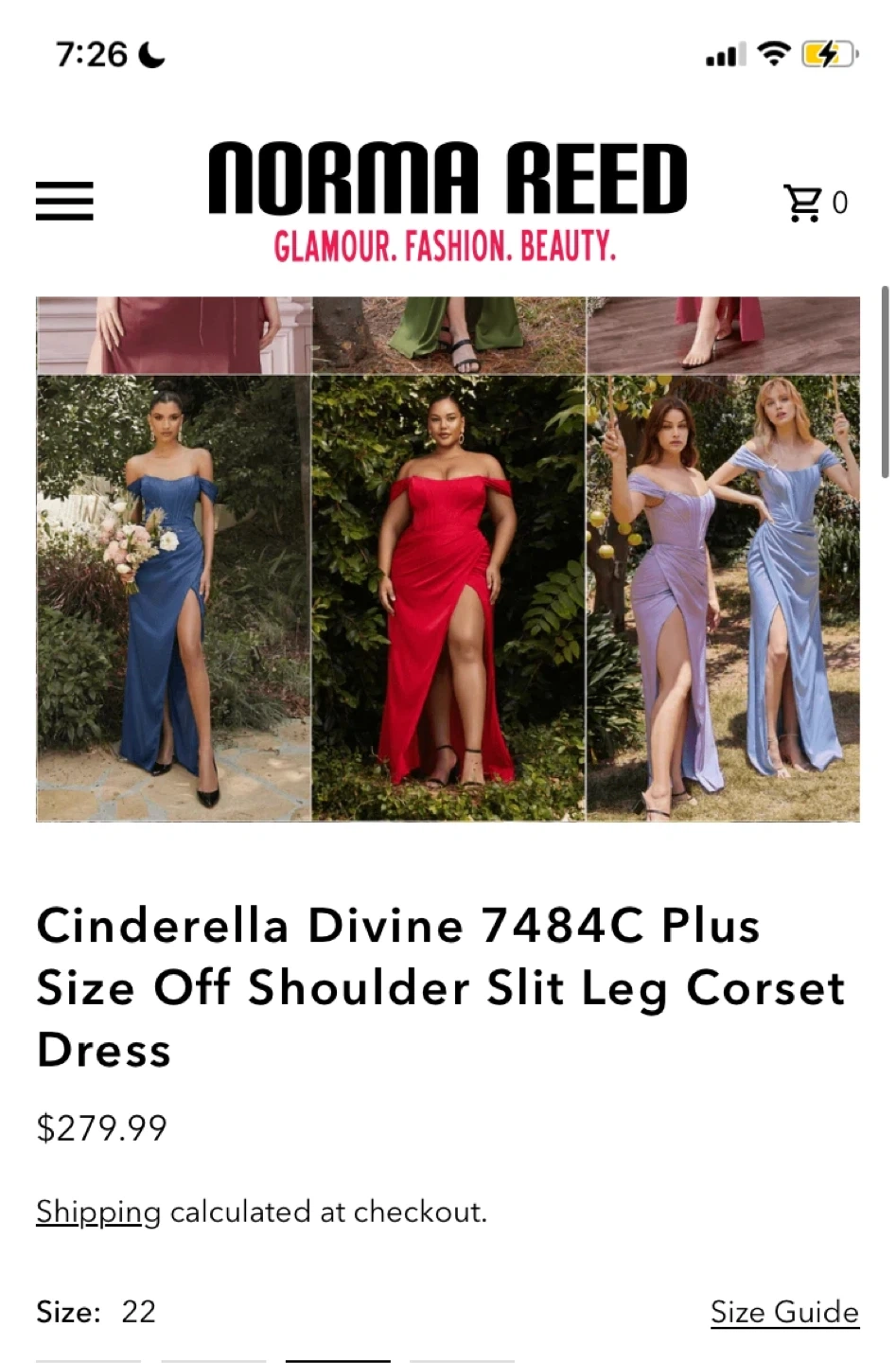 This Cinderella Divine 7484C plus size dress features an off-the-shoulder design with a corset bodice and a daring slit leg. It's a beautiful dusty rose colour with a satin-like sheen. Size 22.