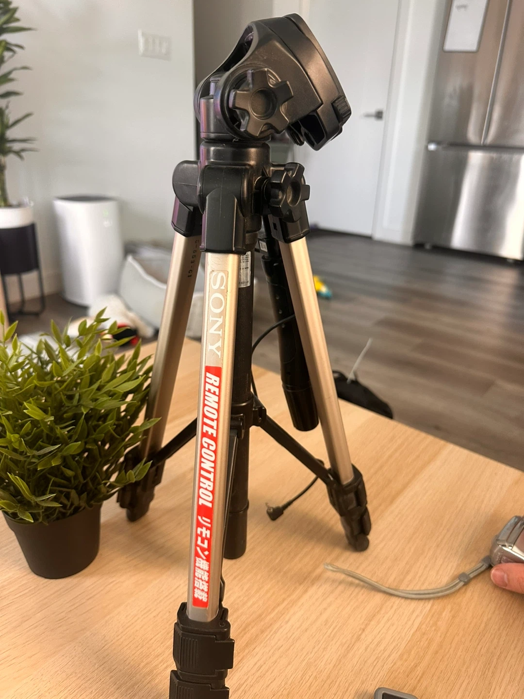 This is a Sony tripod with a remote control function. It's designed for digital still cameras and video cameras. The tripod is made of metal and plastic components.