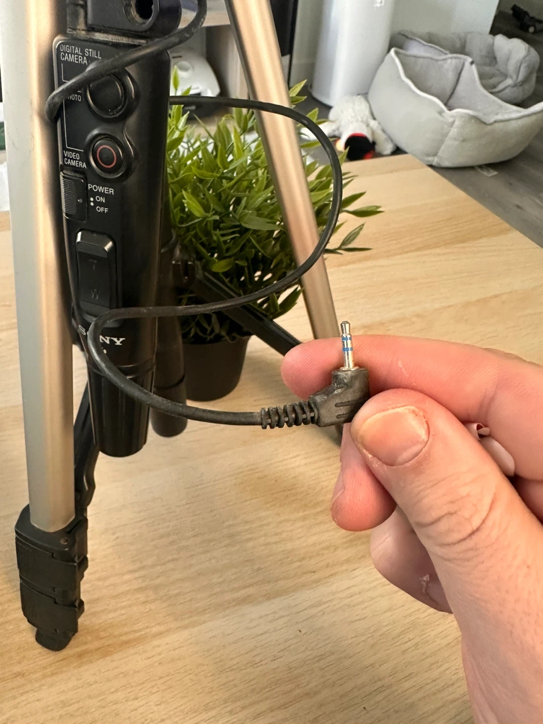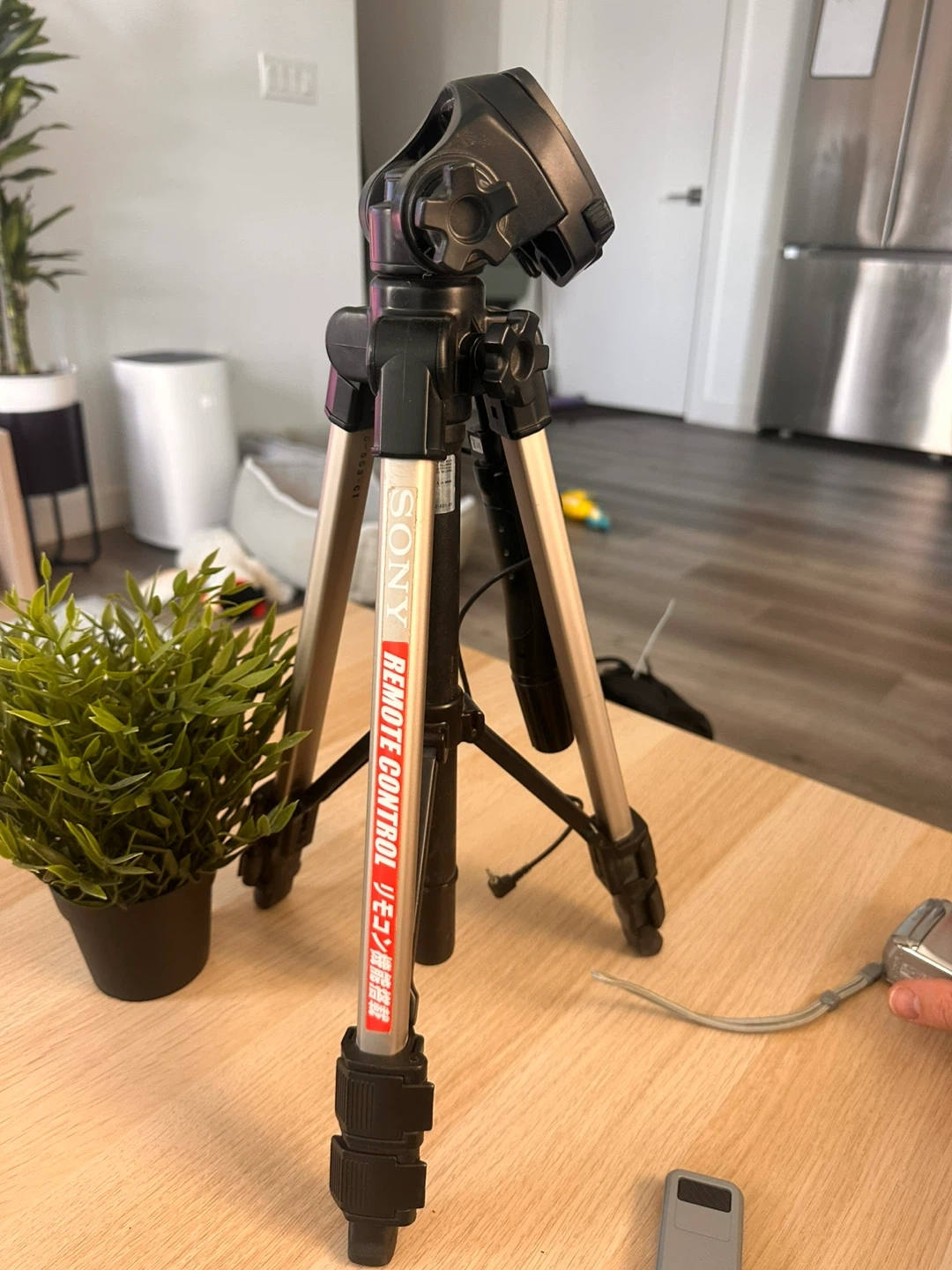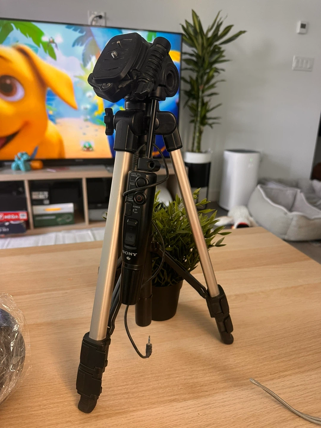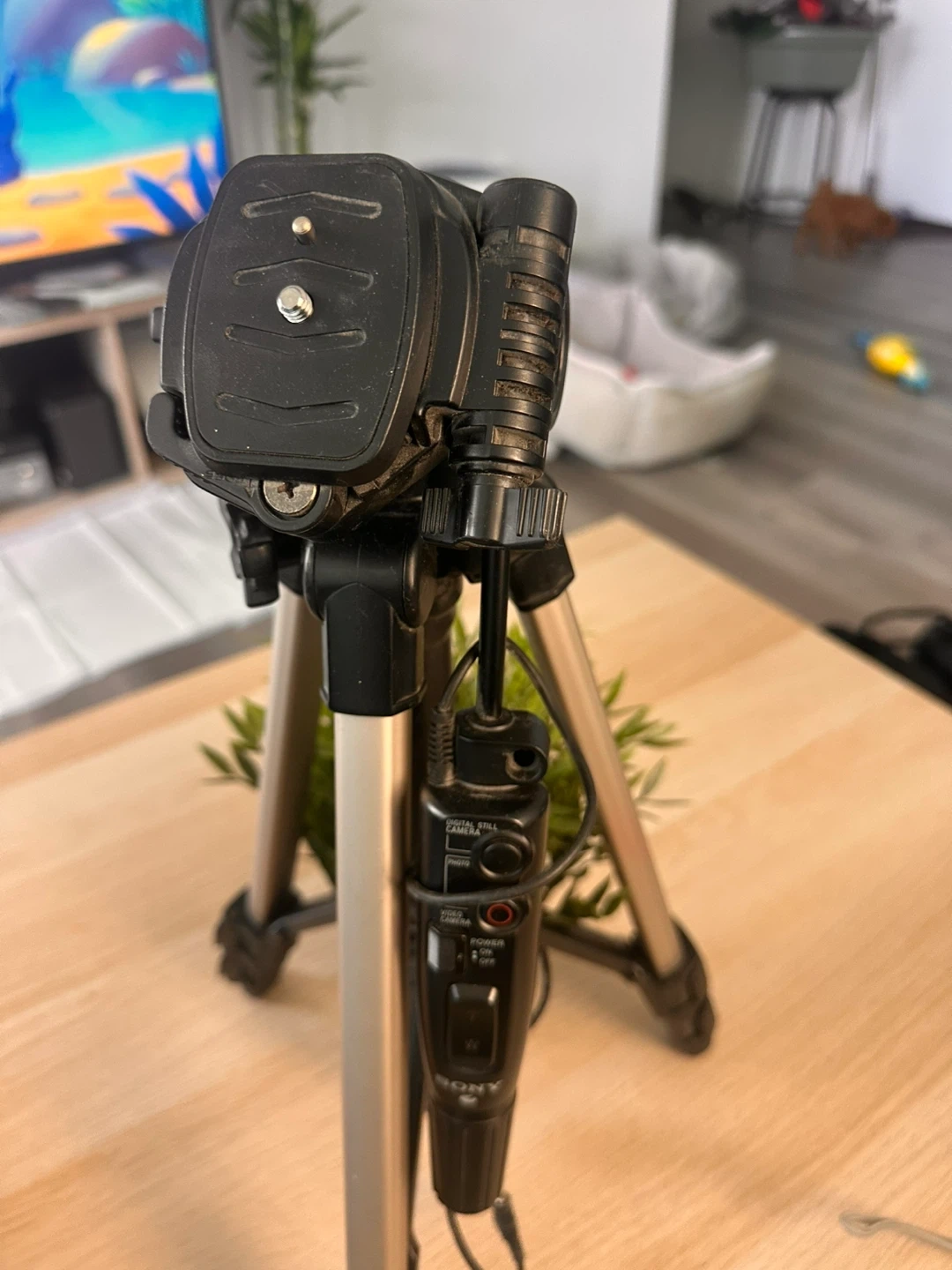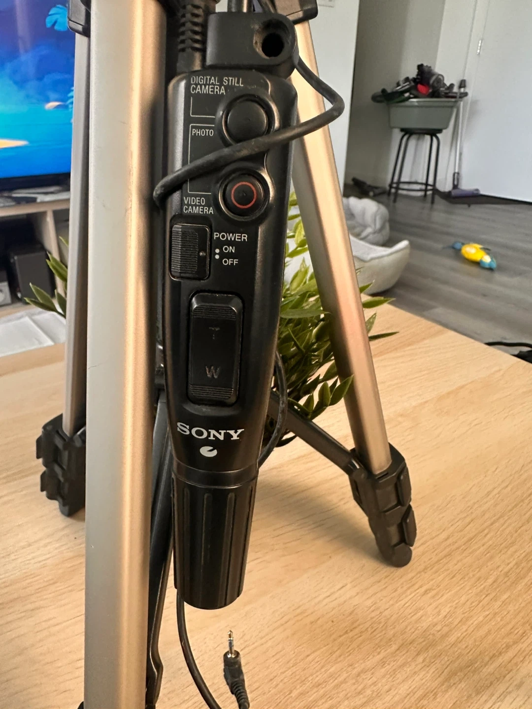 This is a Sony tripod with a remote control function. It's designed for digital still cameras and video cameras. The tripod is made of metal and plastic components.