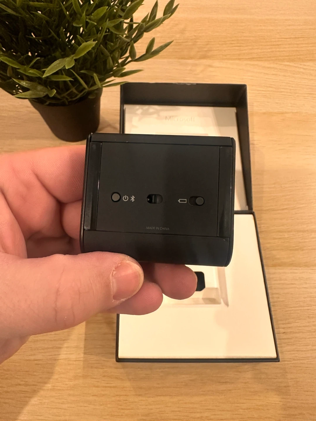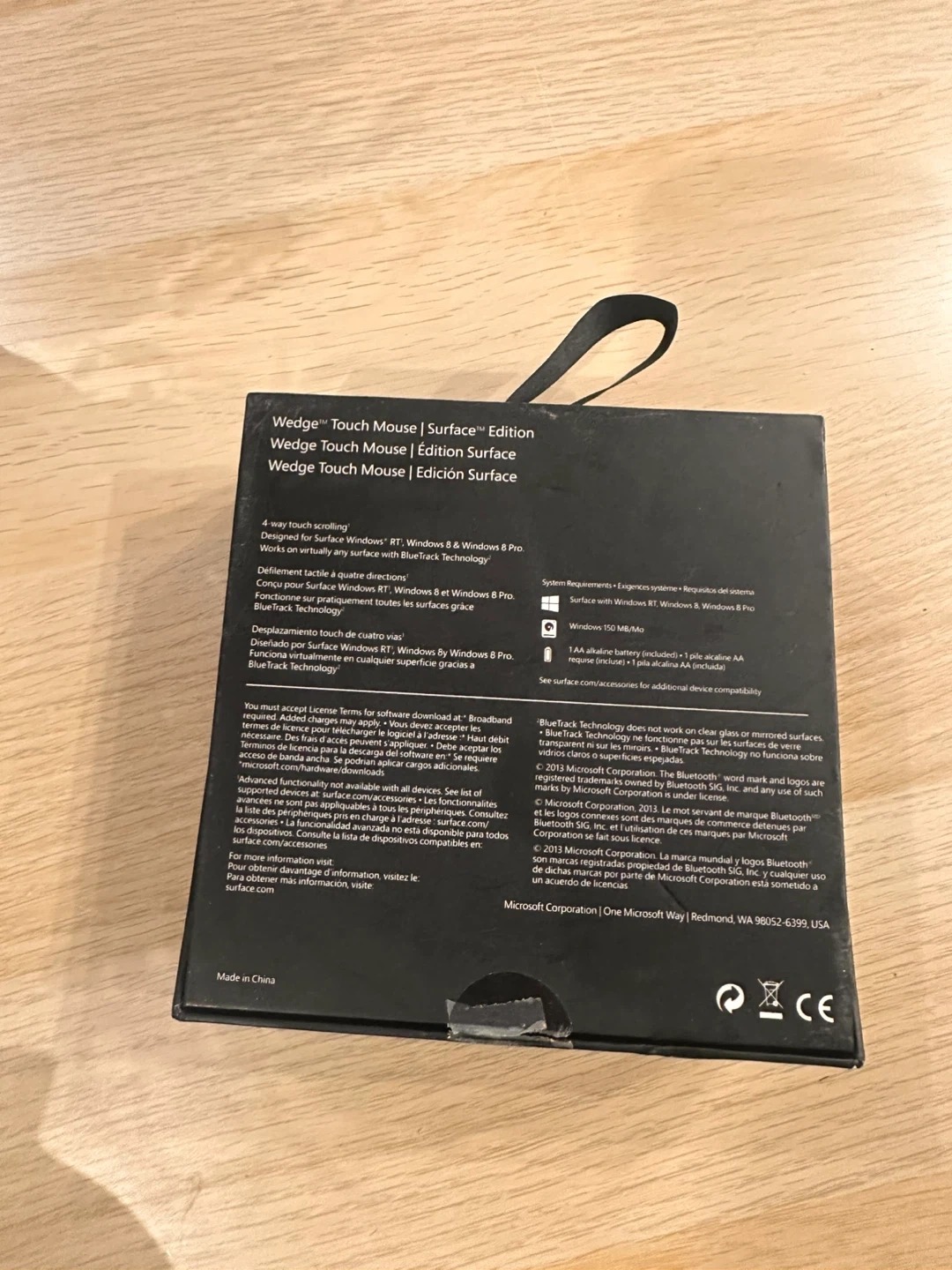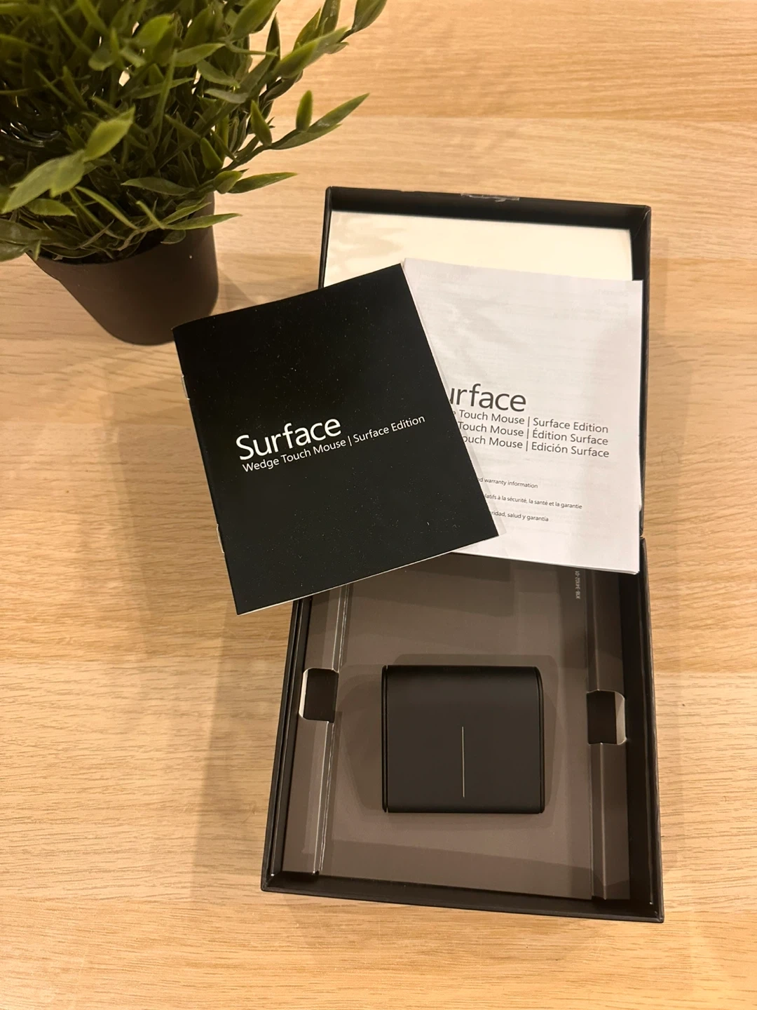 Microsoft Surface Wedge Touch Mouse, complete with its original box. This compact mouse connects wirelessly for convenient use. It's a handy accessory for productivity on the go. The mouse is black.