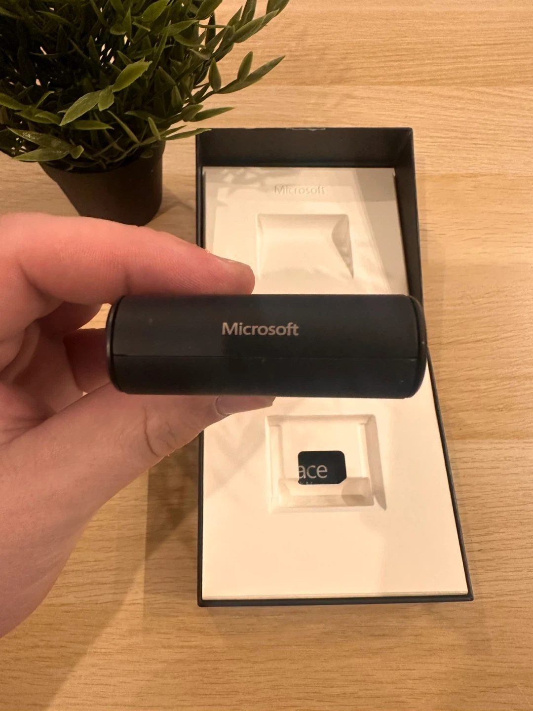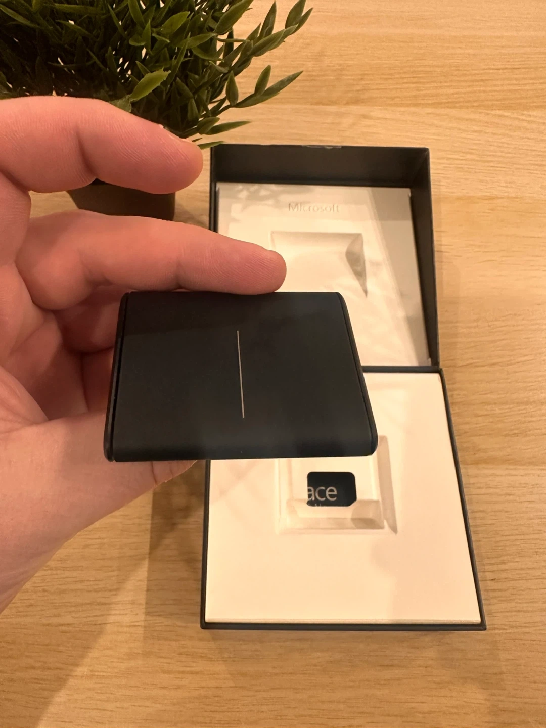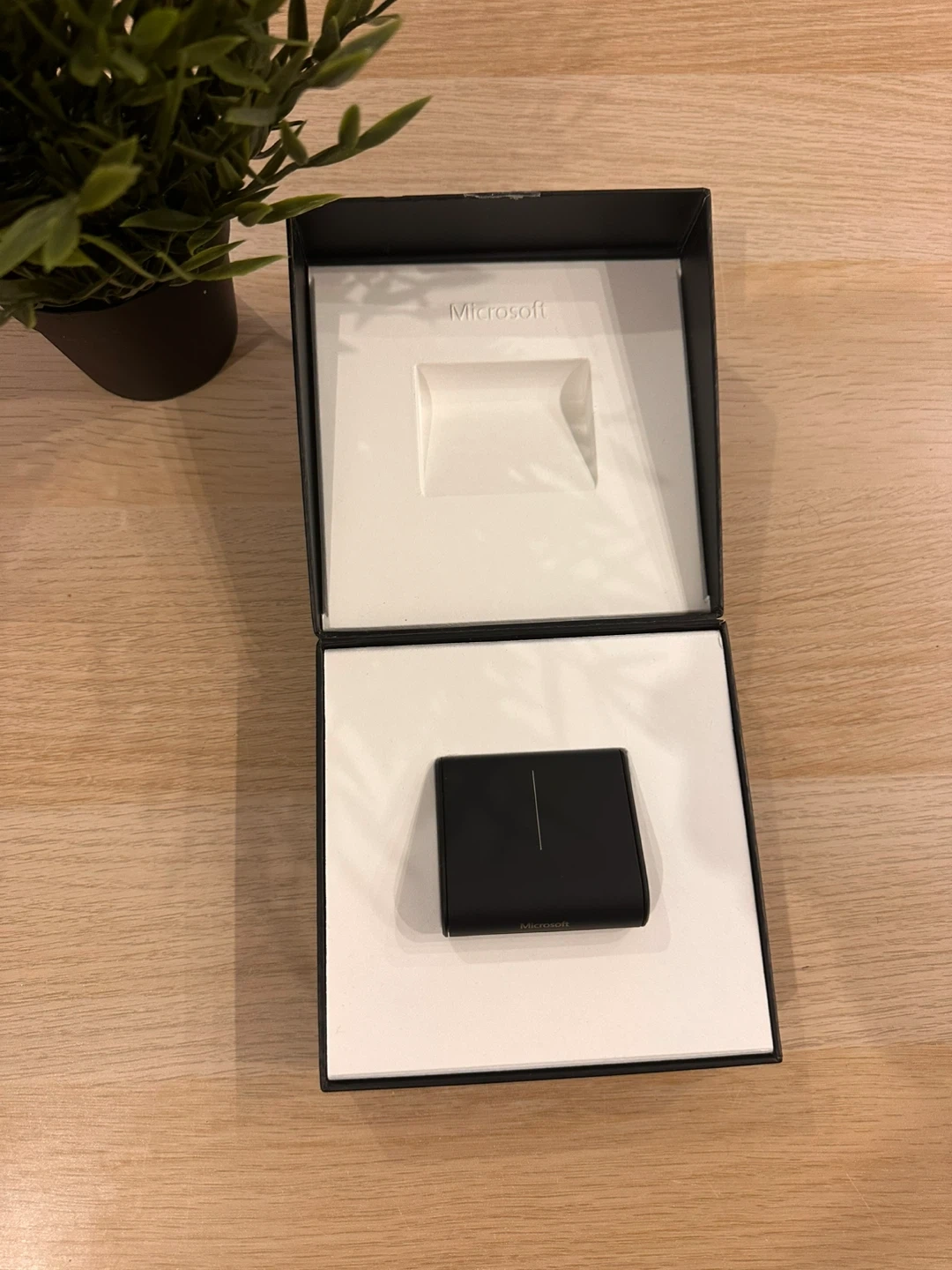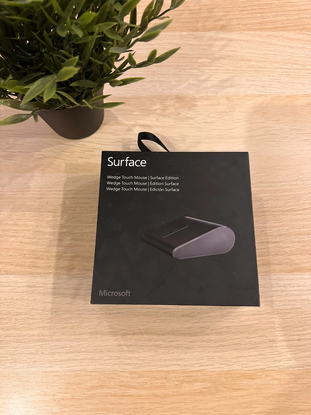 Microsoft Surface Wedge Touch Mouse, complete with its original box. This compact mouse connects wirelessly for convenient use. It's a handy accessory for productivity on the go. The mouse is black.
