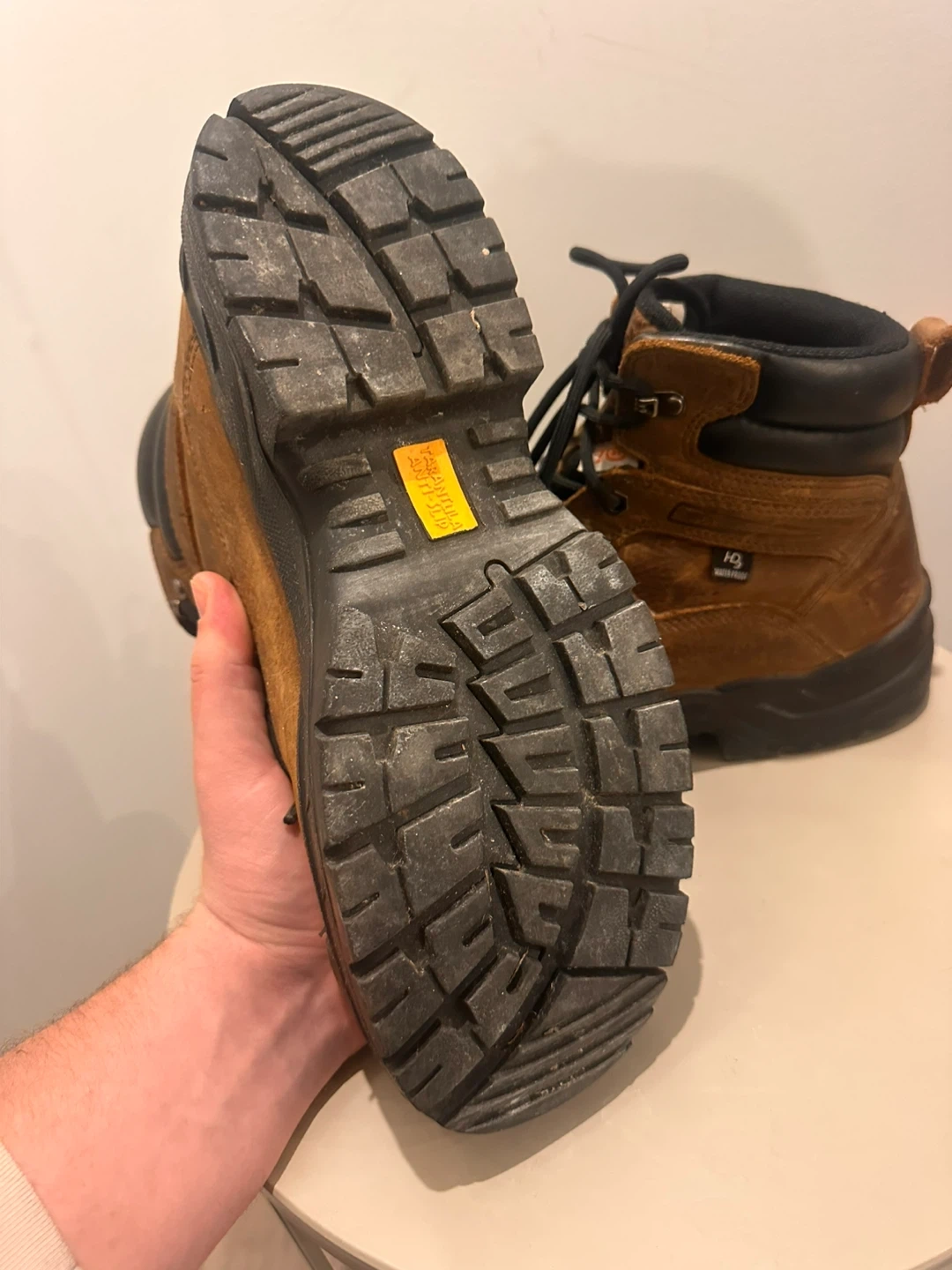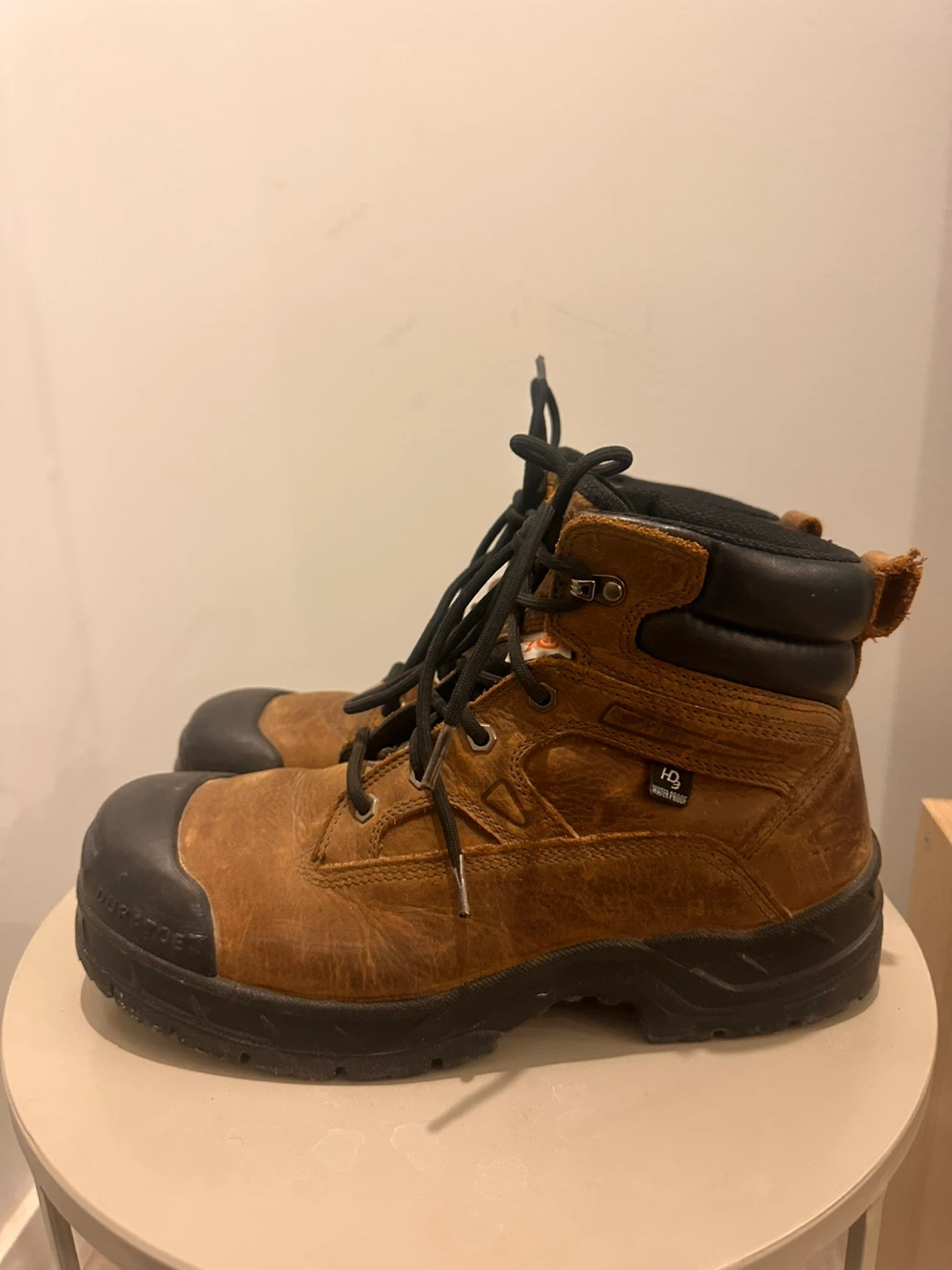 Brown leather work boots with black toe caps and soles. Waterproof construction. Lace-up closure for a secure fit. These boots are built for durability on the job site.