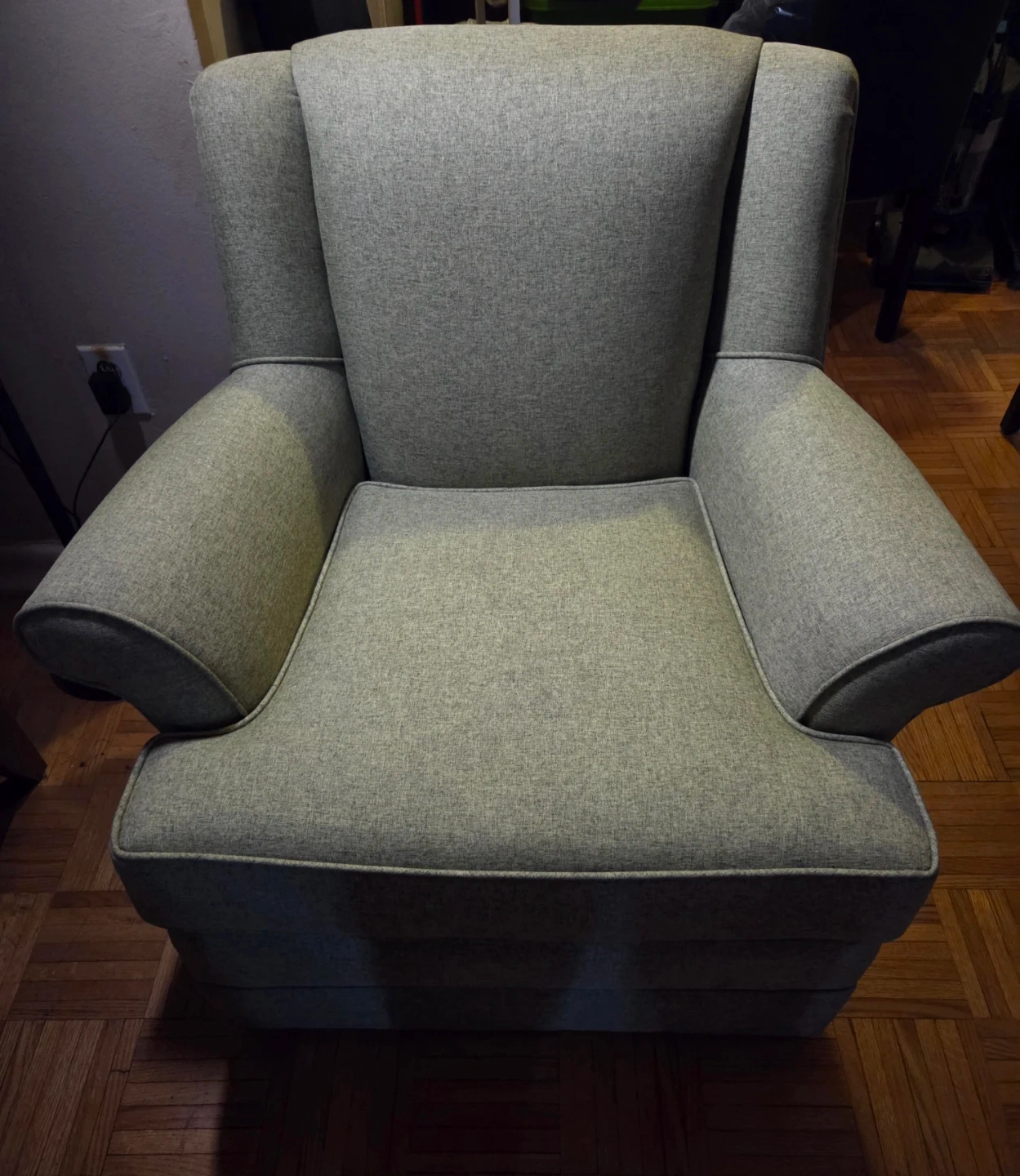 green tweed fabric. It has padded arms and a high back for support. Great for a reading nook or extra seating. Excellent condition.