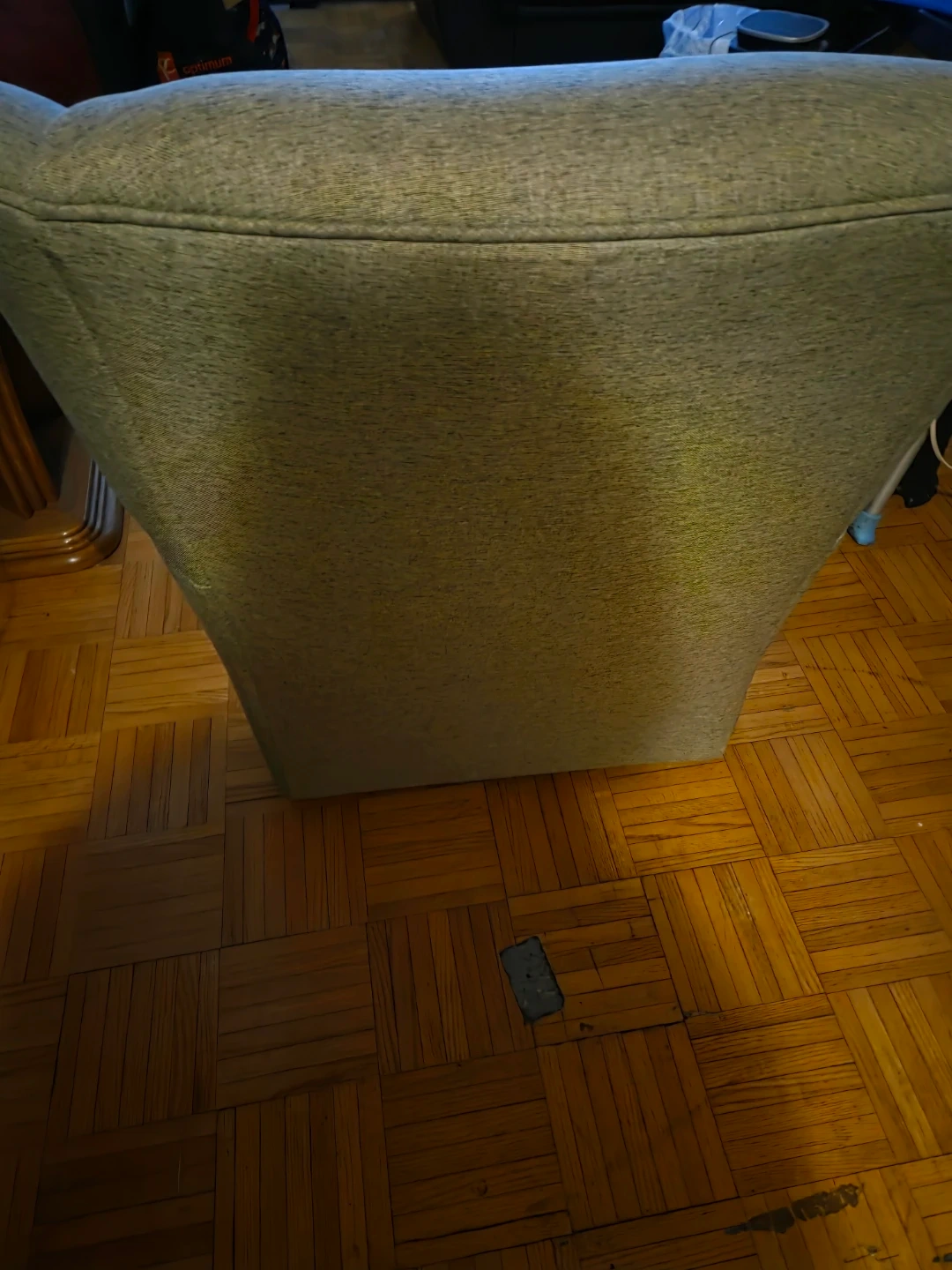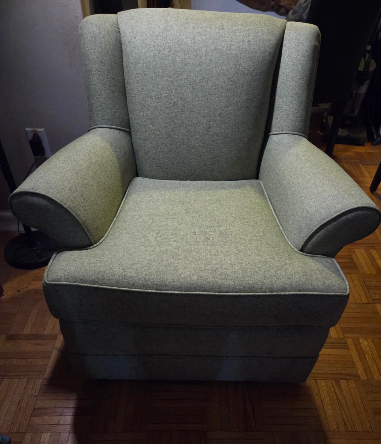 green tweed fabric. It has padded arms and a high back for support. Great for a reading nook or extra seating. Excellent condition.