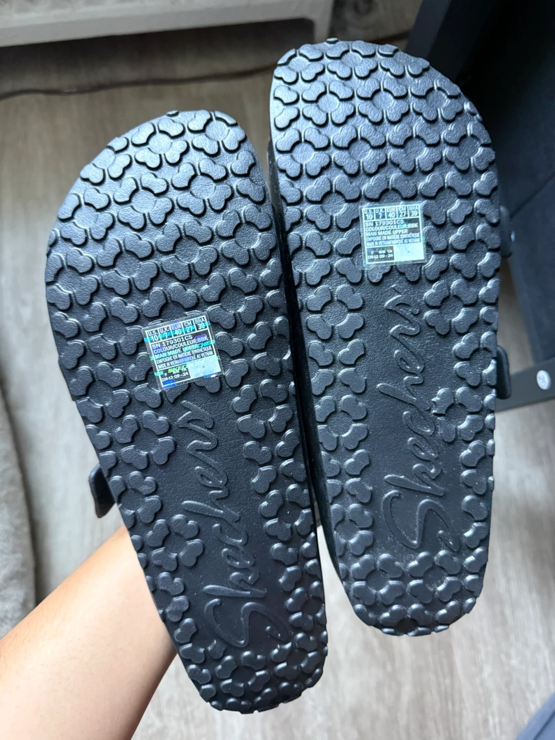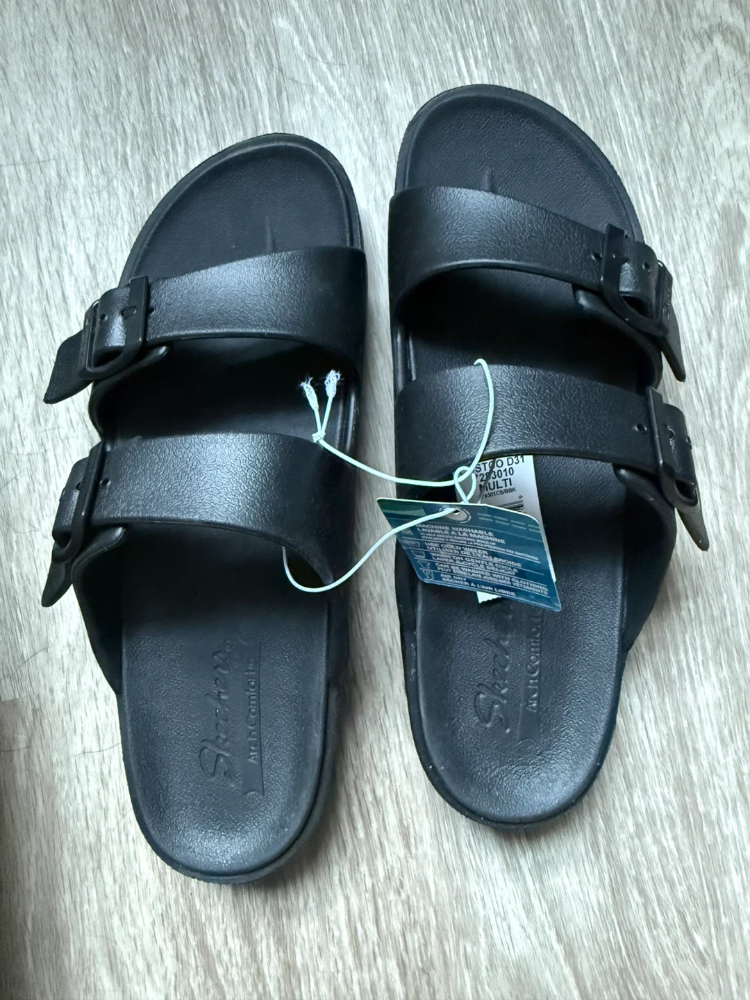 These Skechers sandals are black and feature dual adjustable straps. These are never used, and new with tags.