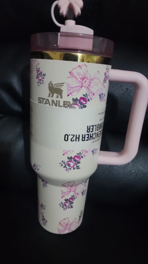 This is a Stanley Loveshack Quencher H2.0 tumbler. It's a large capacity mug with a handle and a straw lid. The design features a floral pattern with pink bows. brand new in box