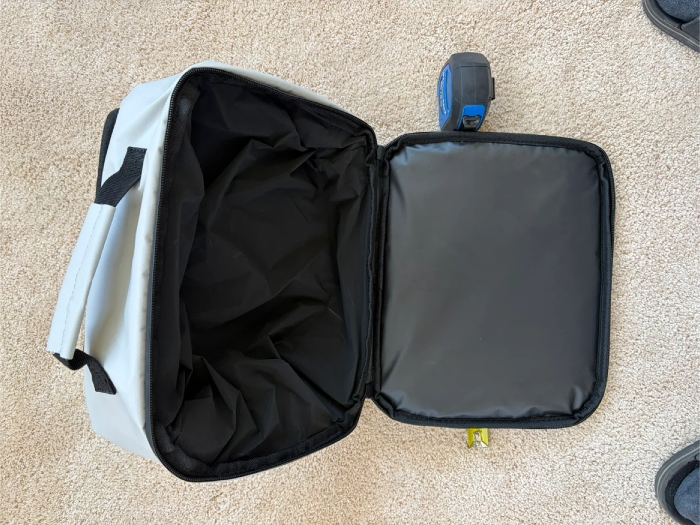 Durable material, zippered compartment, bungee cord system outside, strong handles.