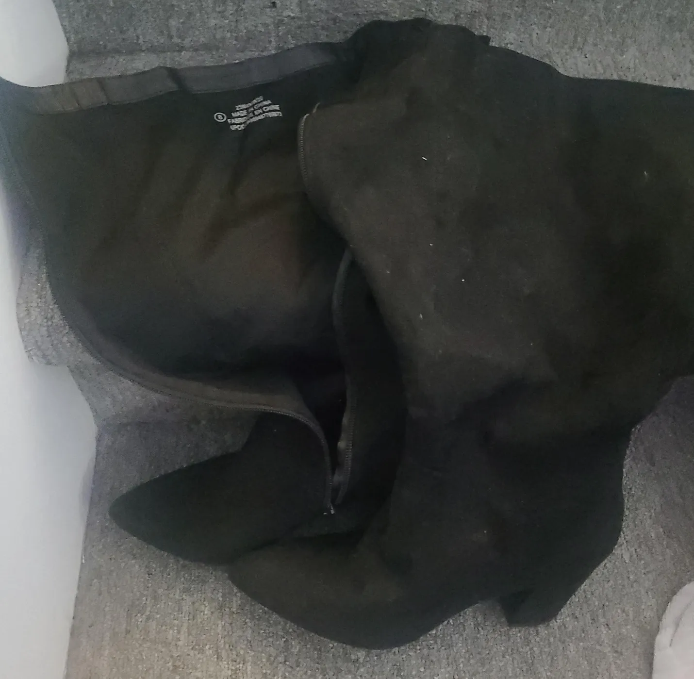 Black knee-high boots with a side zipper. These boots are size 8 and appear to be made of a faux-suede material. The heel height is approximately 2.5 inches.