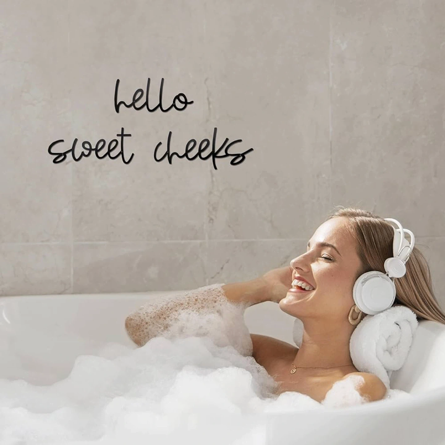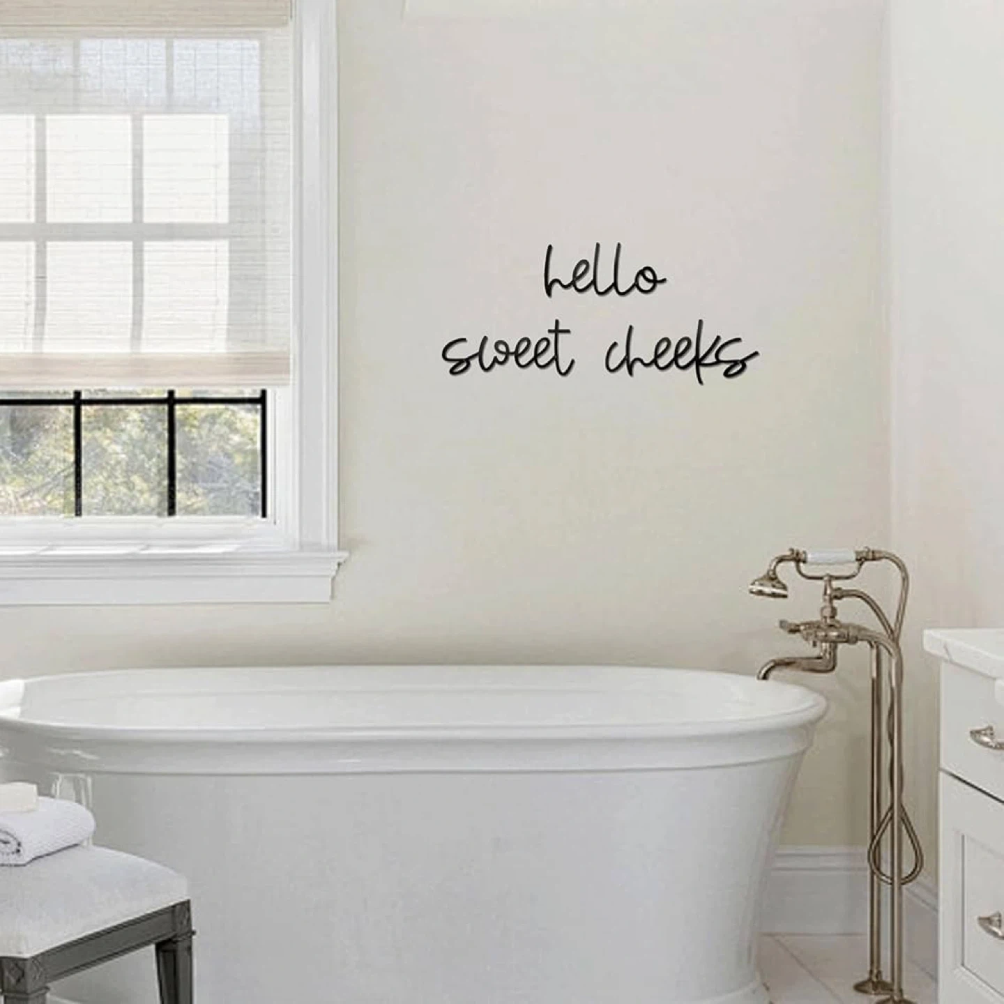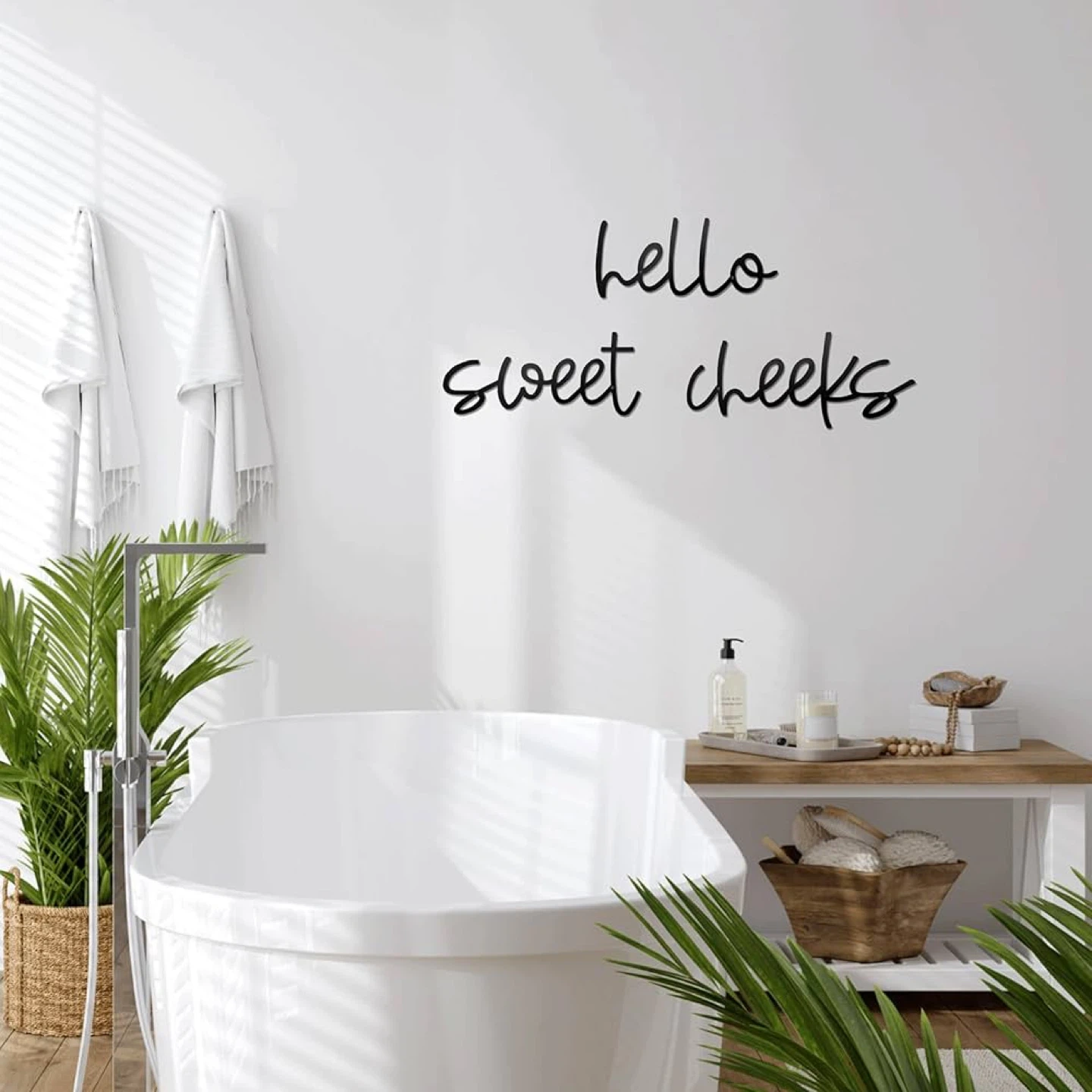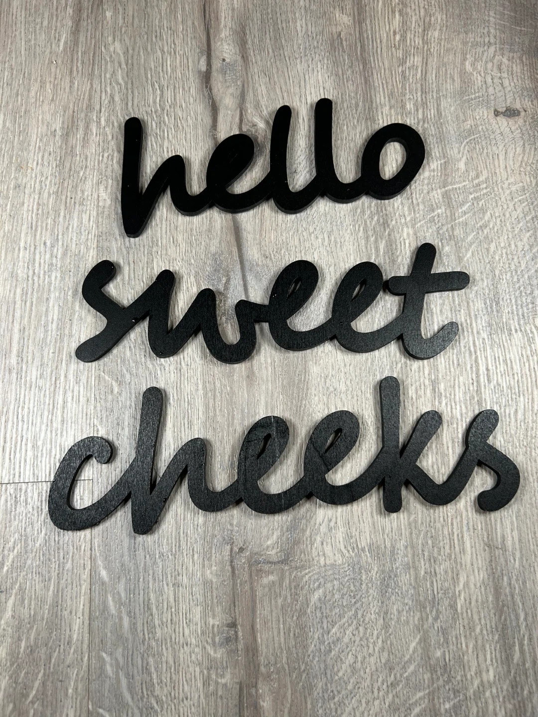 This black script wall decor spells out "hello sweet cheeks". It's made of wood and designed for easy hanging in a bathroom or bedroom. Adds a playful touch to any space!