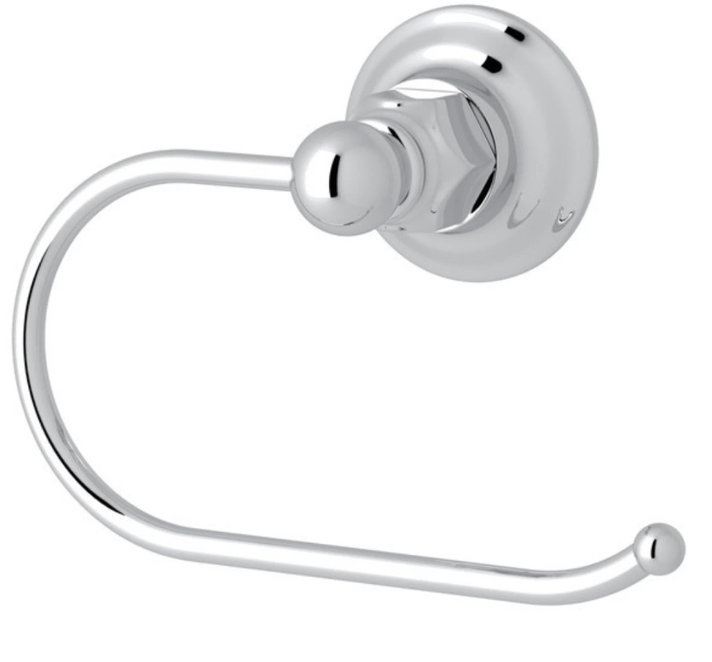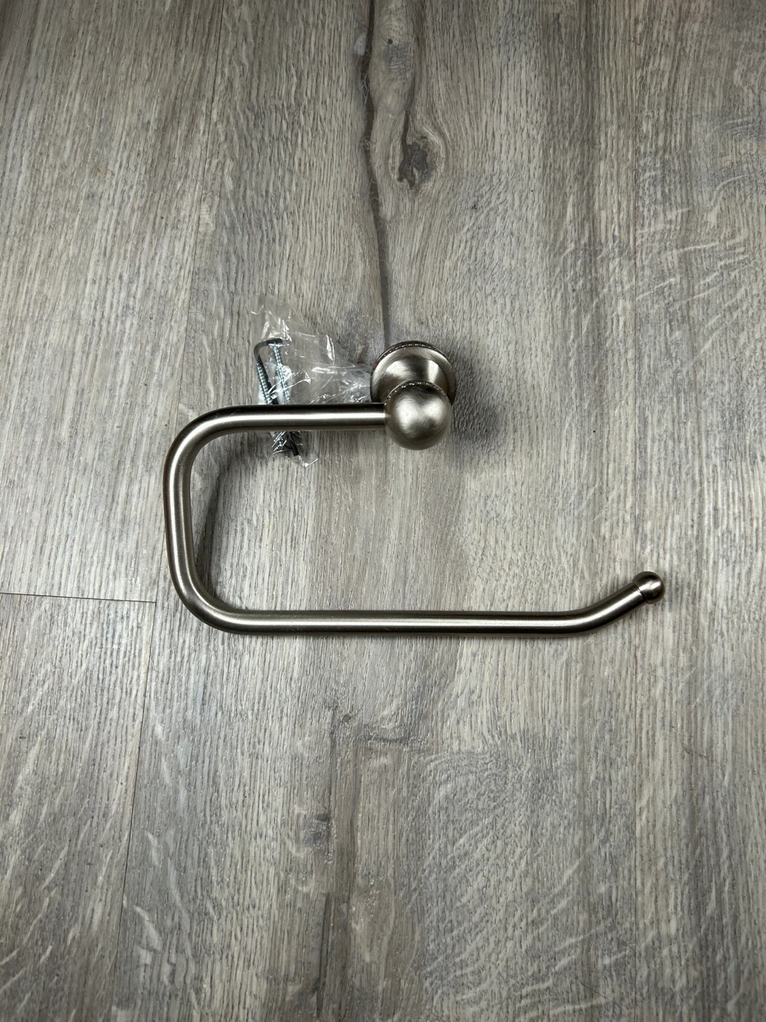 This toilet paper holder is made of brushed nickel. It's designed for wall mounting and includes screws for installation. This holder is a practical addition to any bathroom.