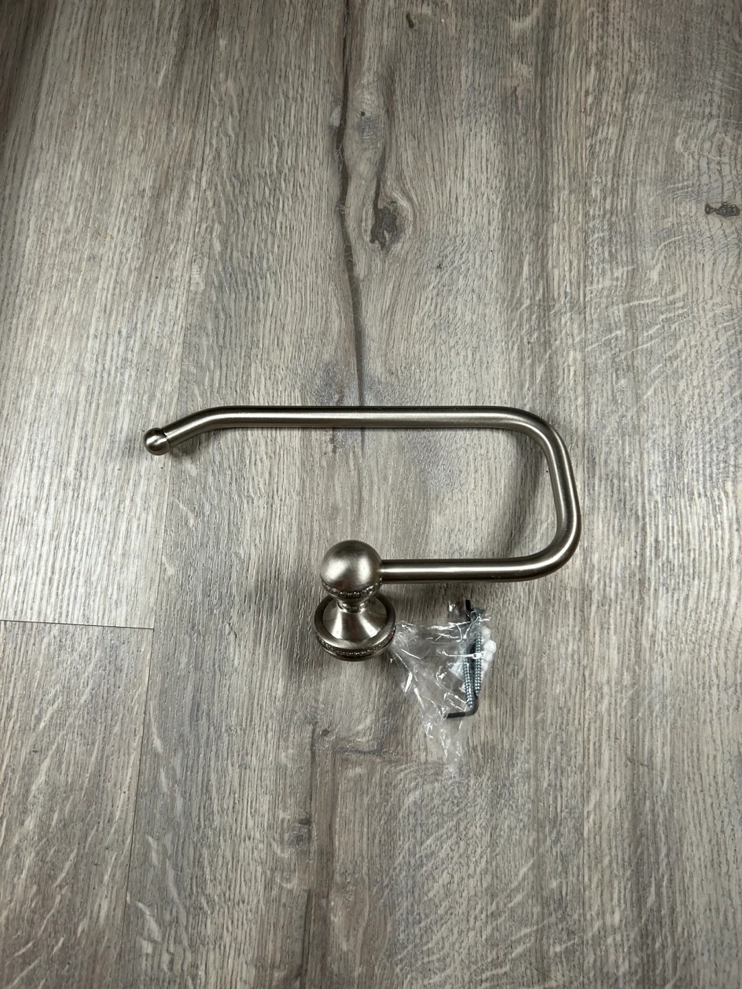 This toilet paper holder is made of brushed nickel. It's designed for wall mounting and includes screws for installation. This holder is a practical addition to any bathroom.