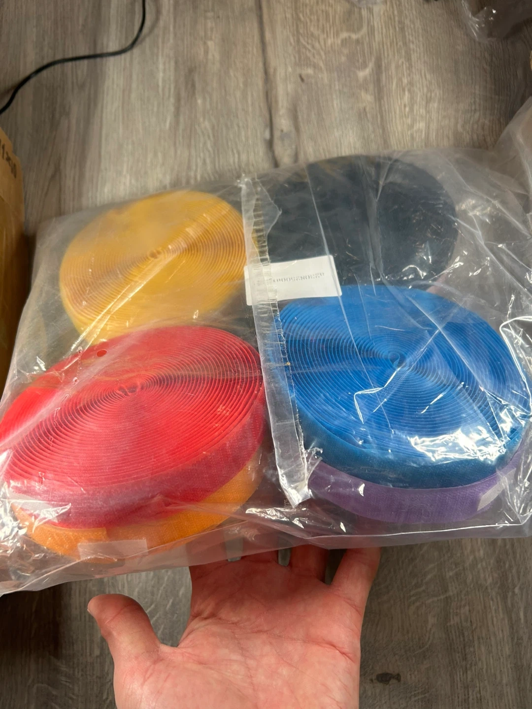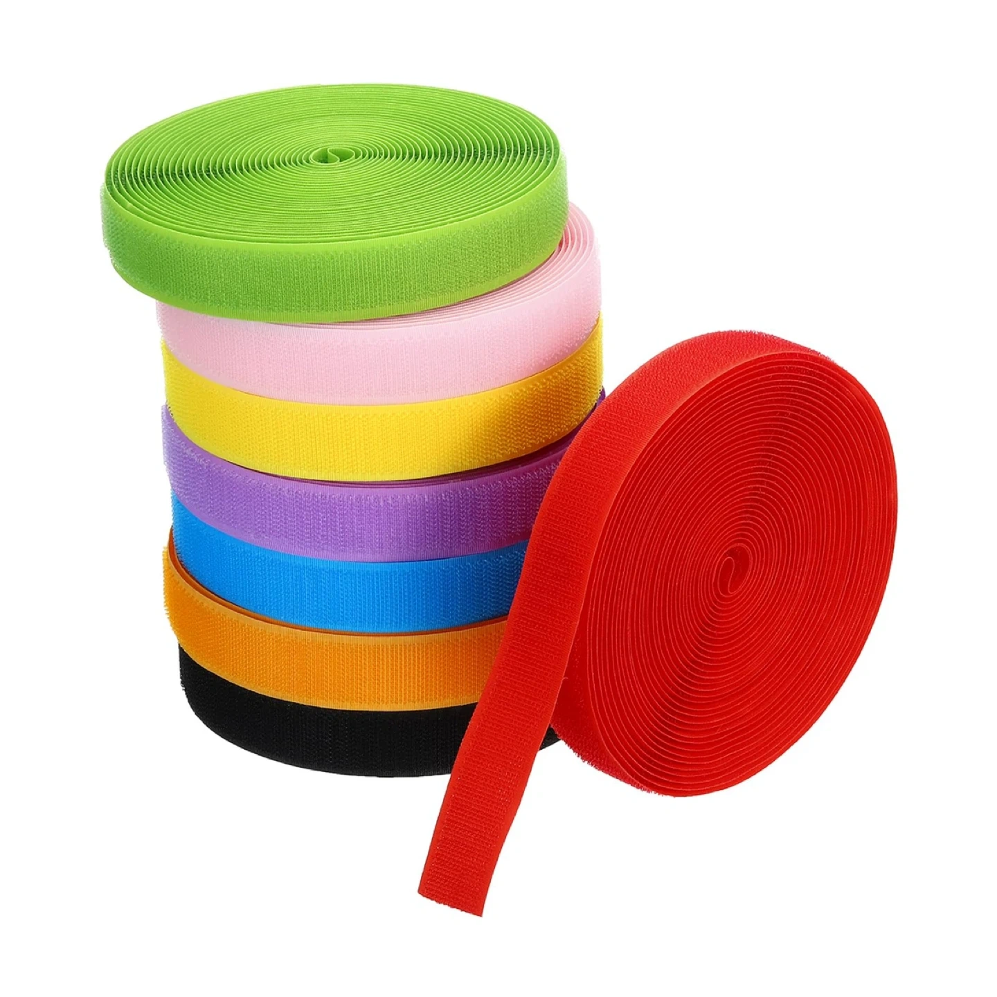 You'll get 8 rolls of hook and loop fastener tape in assorted colours. Each roll is 21.0 ft long. This is the hook and loop side, great for crafting or organizing! It's made in China.