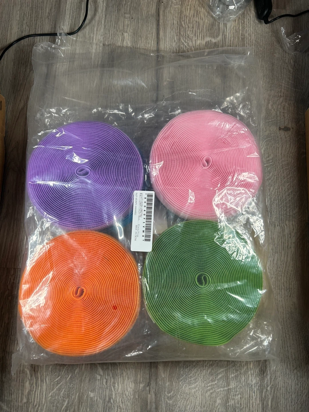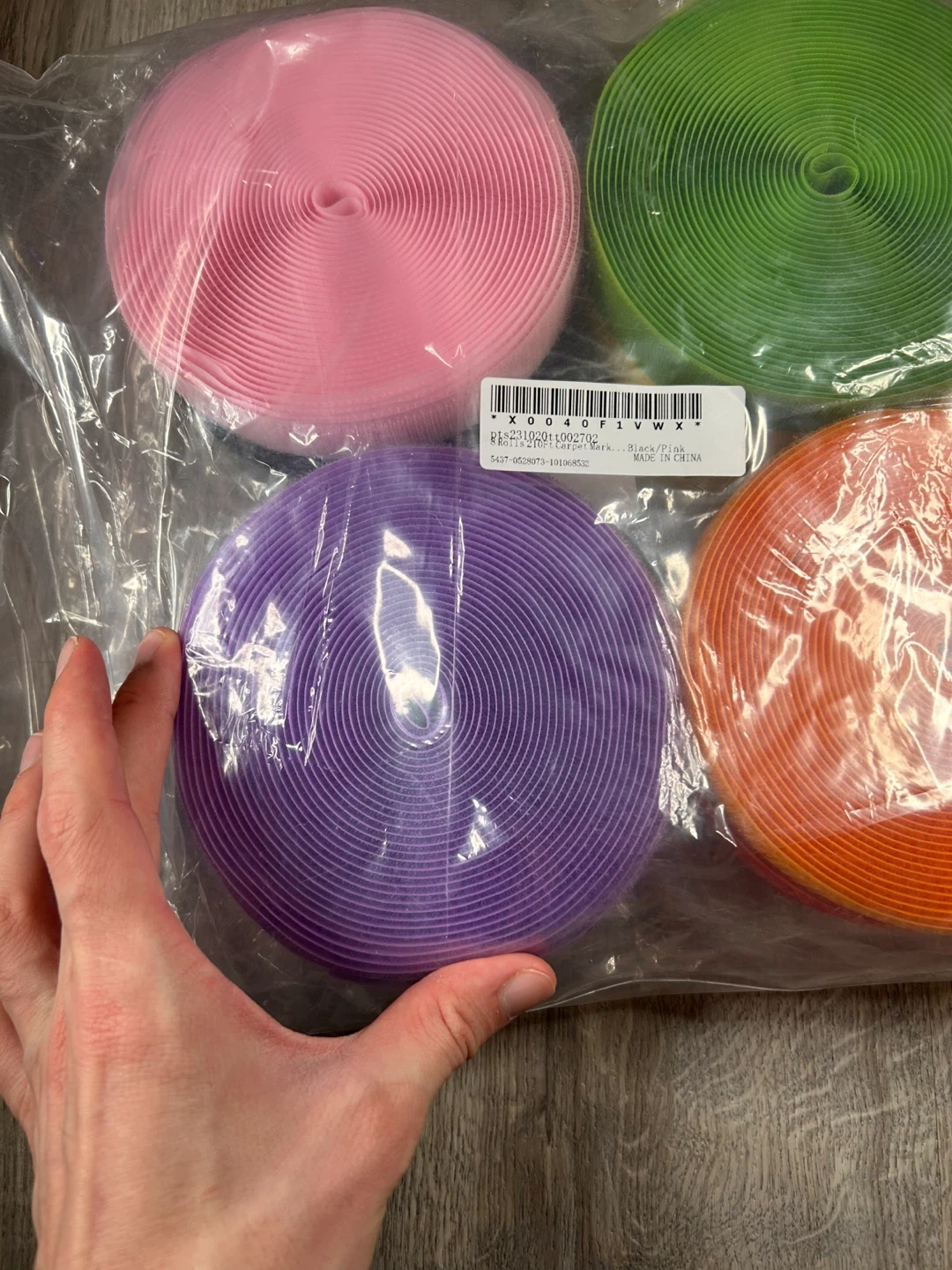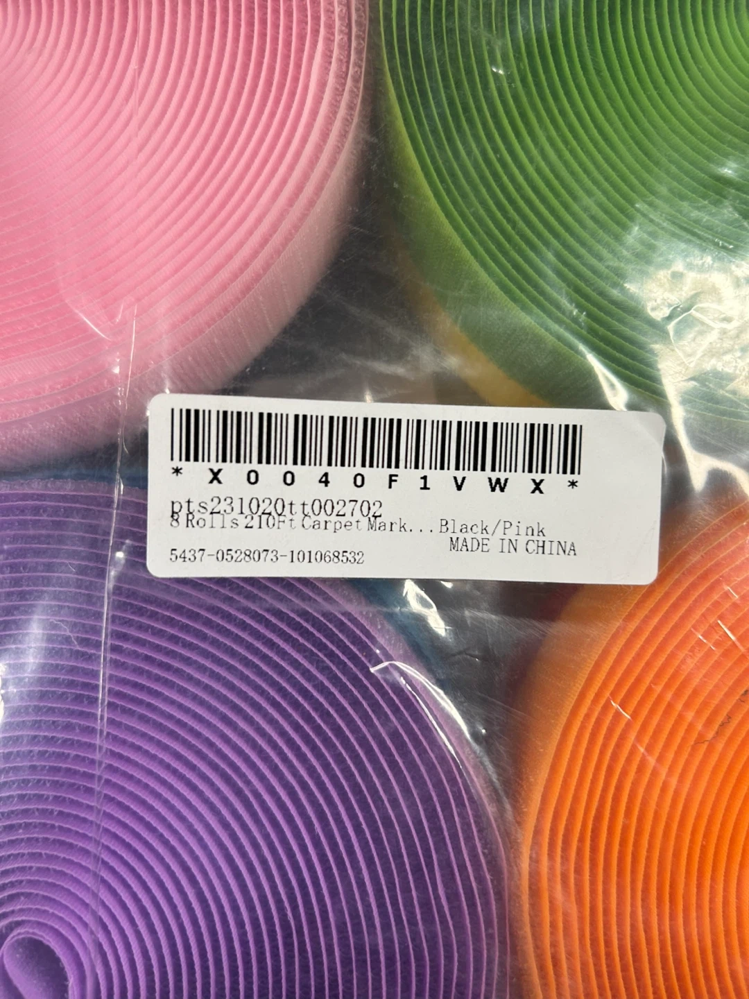 You'll get 8 rolls of hook and loop fastener tape in assorted colours. Each roll is 21.0 ft long. This is the hook and loop side, great for crafting or organizing! It's made in China.