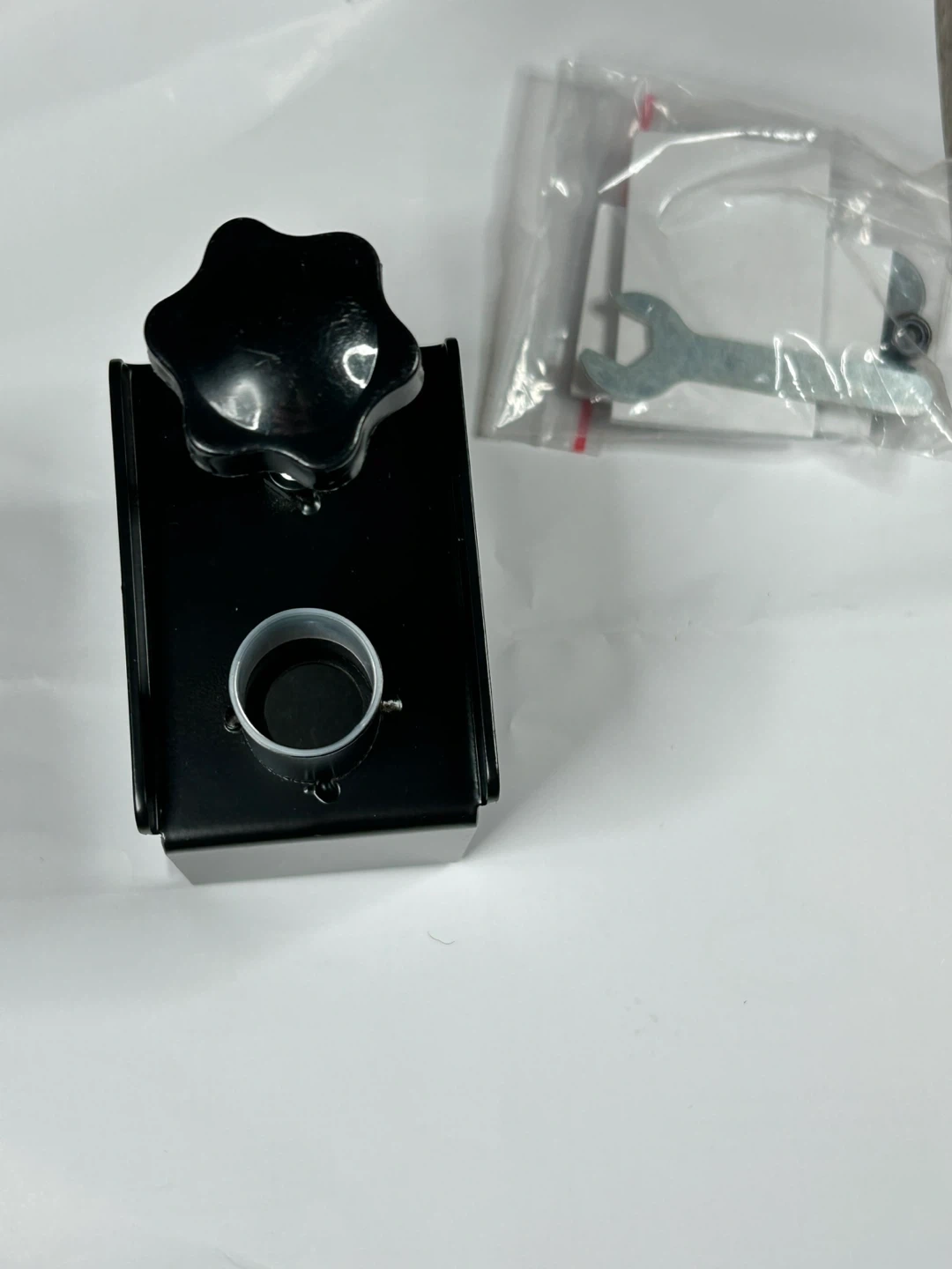 This black metal desk mount clamp comes with all the necessary hardware for installation, as shown in the manual. It's designed for easy attachment to surfaces. This clamp is useful for securely holding items on a desk or workbench.