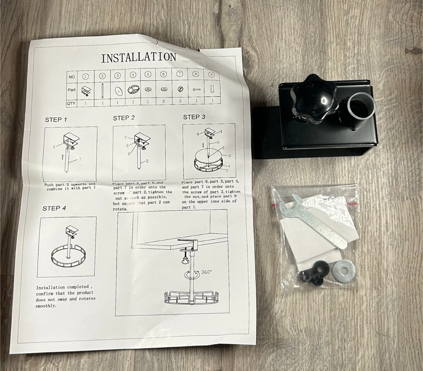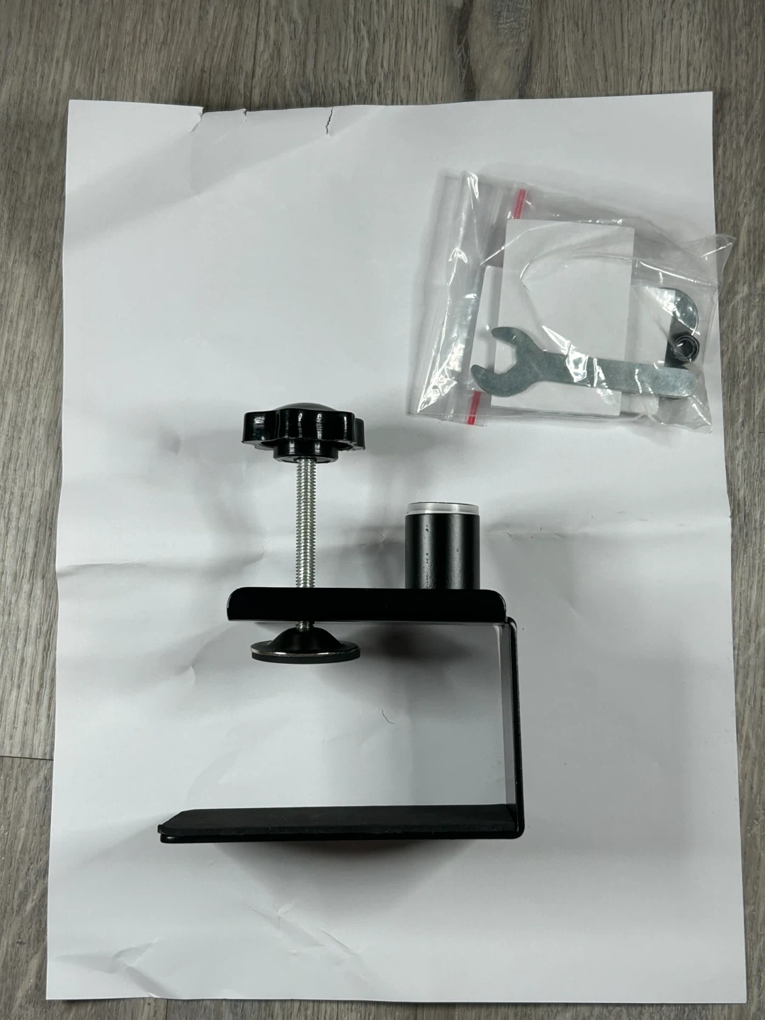 This black metal desk mount clamp comes with all the necessary hardware for installation, as shown in the manual. It's designed for easy attachment to surfaces. This clamp is useful for securely holding items on a desk or workbench.