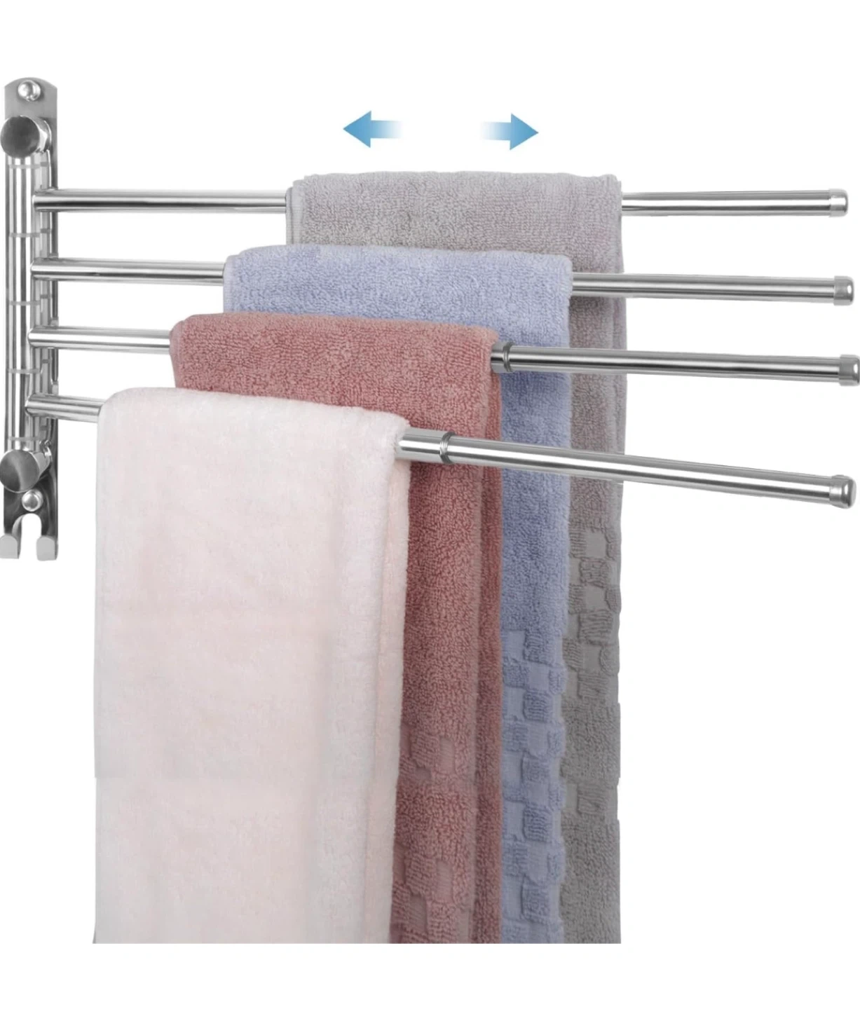 Wall-mounted towel rack with four swinging arms. Keep your towels and other items dry and organized. It's made of stainless steel and mounts easily to the wall.