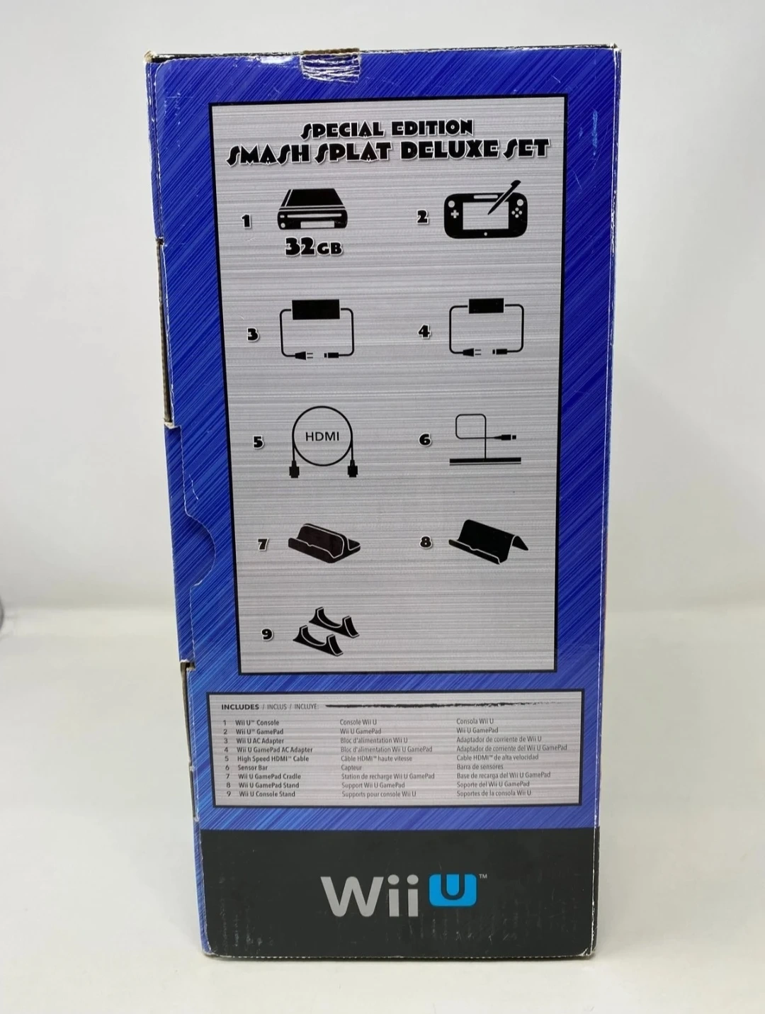 Comes pre-installed with Splatoon & Super Smash Bros on the system. Console, gamepad, adapter, stand, and charger are included.