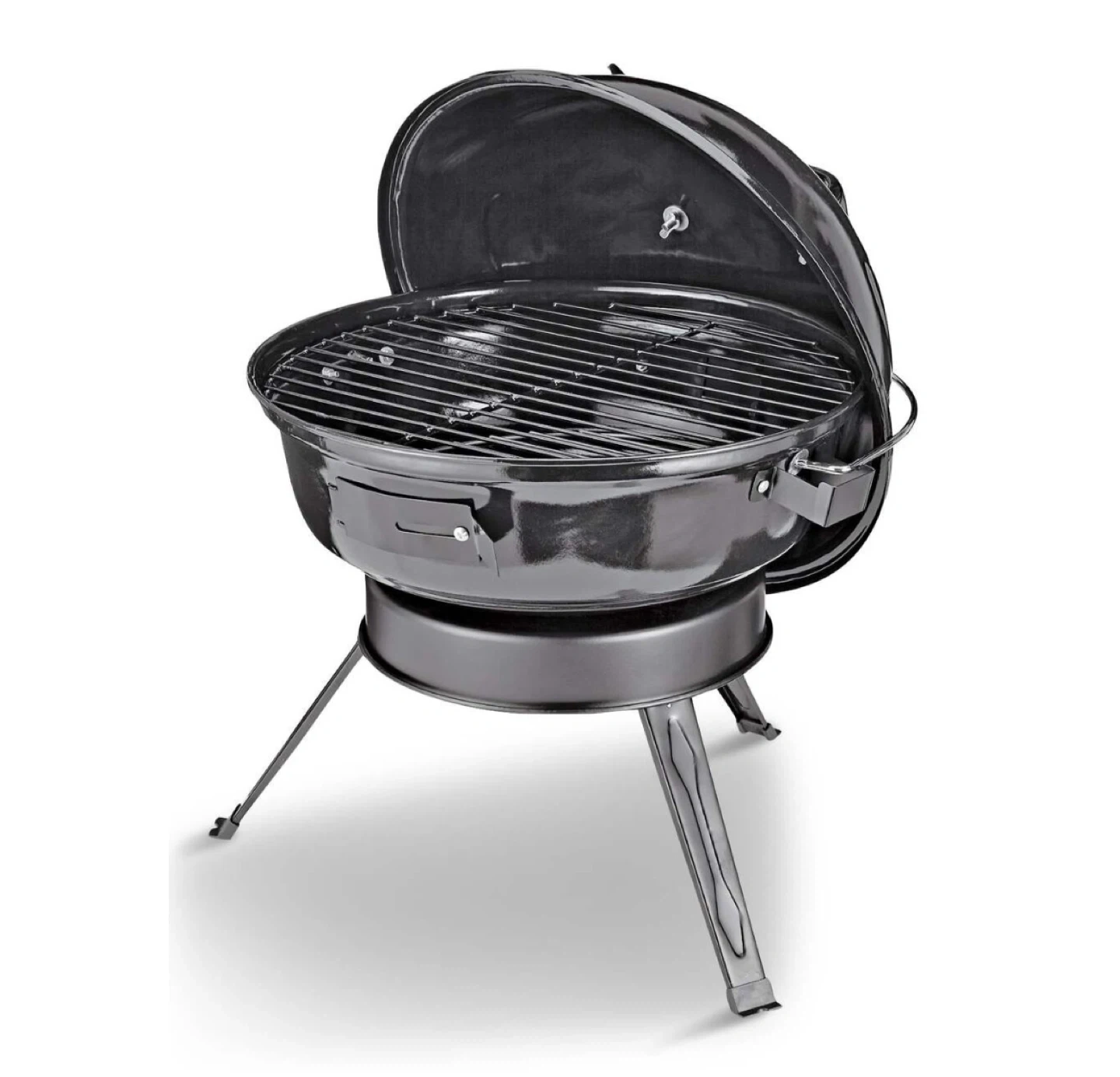 Master Chef portable charcoal kettle BBQ grill. Features a porcelain-coated cooking grate and powder-coated lid with carry handle. It has a 141 sq. in. cooking area. The grill's dimensions are 16.13" W x 20.38" H.