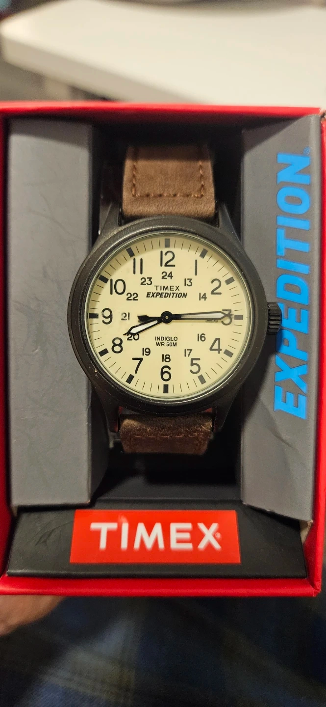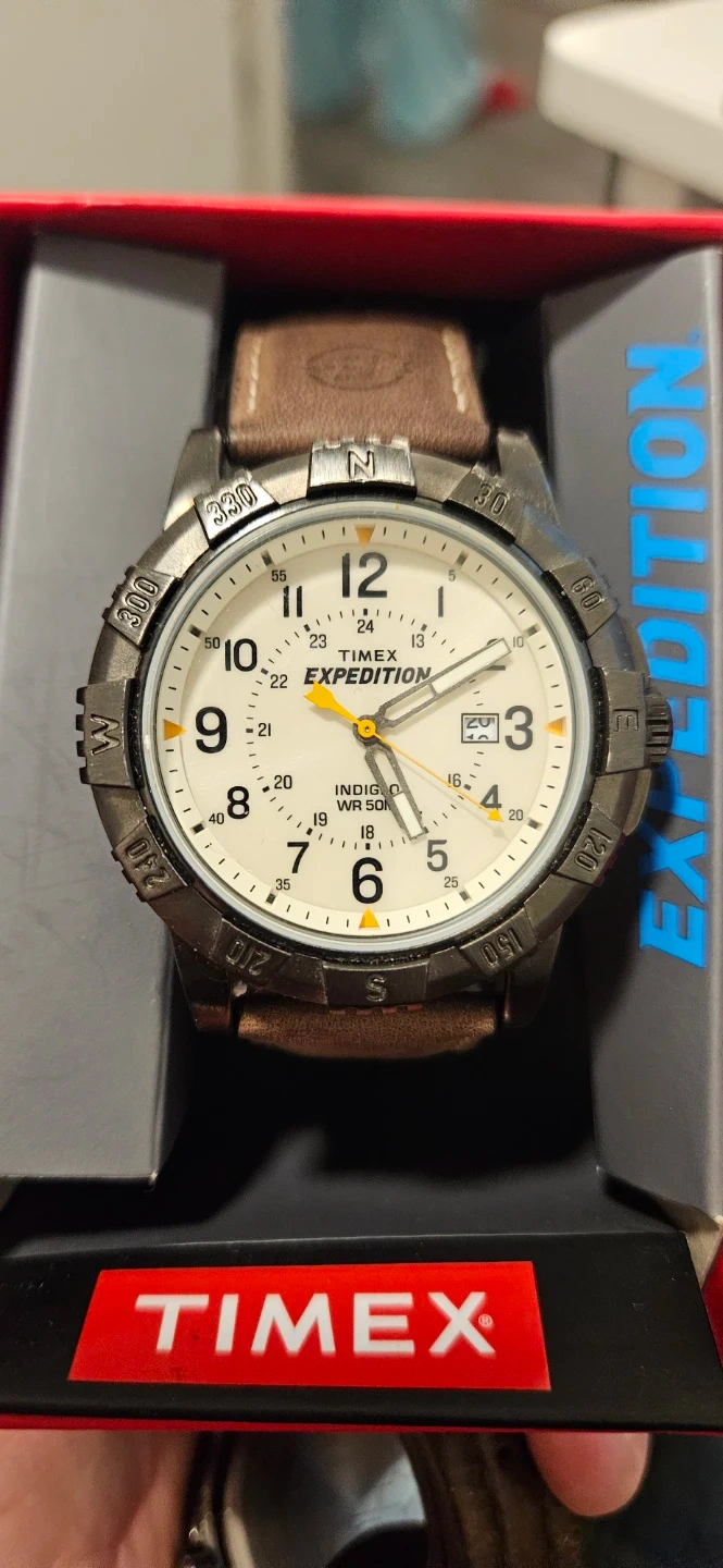 Timex Expedition watch with a cream dial and brown leather strap. It features INDIGLO night-light and 50M water resistance. This watch is great for outdoor use.