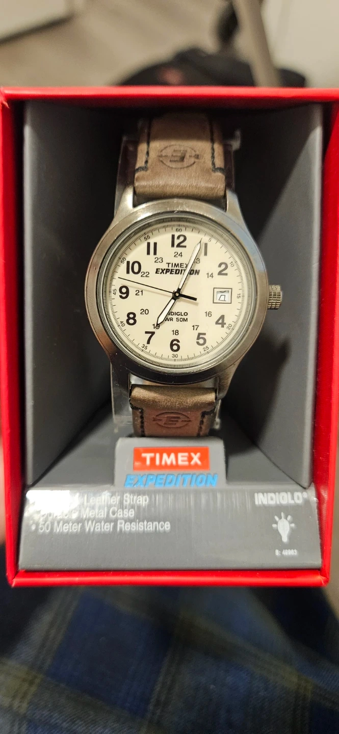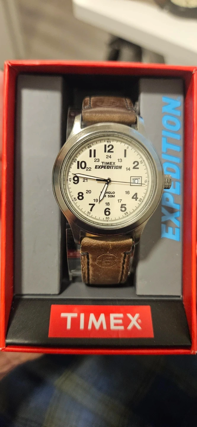 Timex Expedition watch with a cream dial and brown leather strap. It features INDIGLO night-light and 50M water resistance. This watch is great for outdoor use.