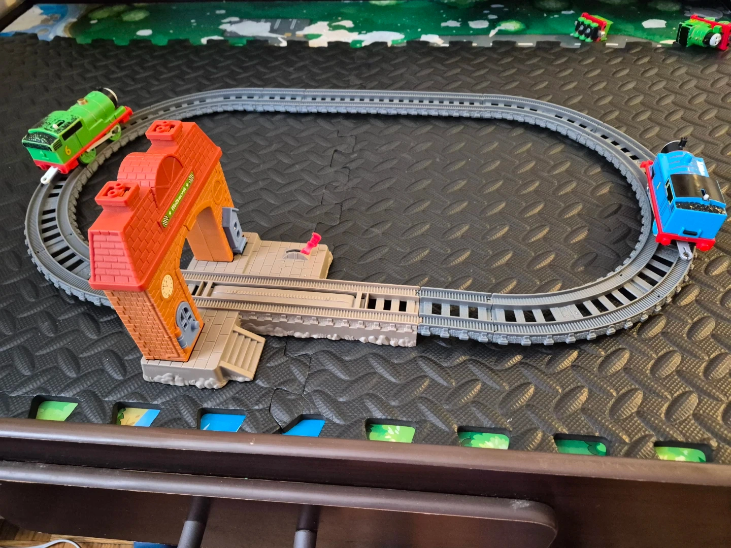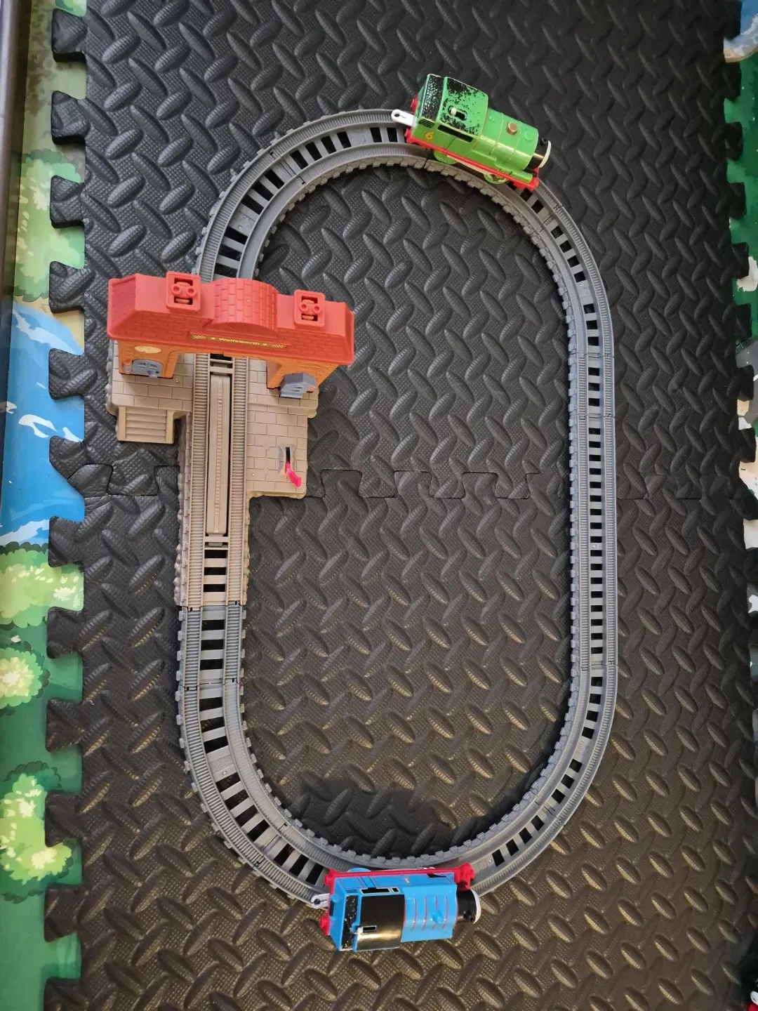 A fun train set featuring Thomas the Tank Engine and a friend. Includes train tracks and a station house. Great for little engineers!