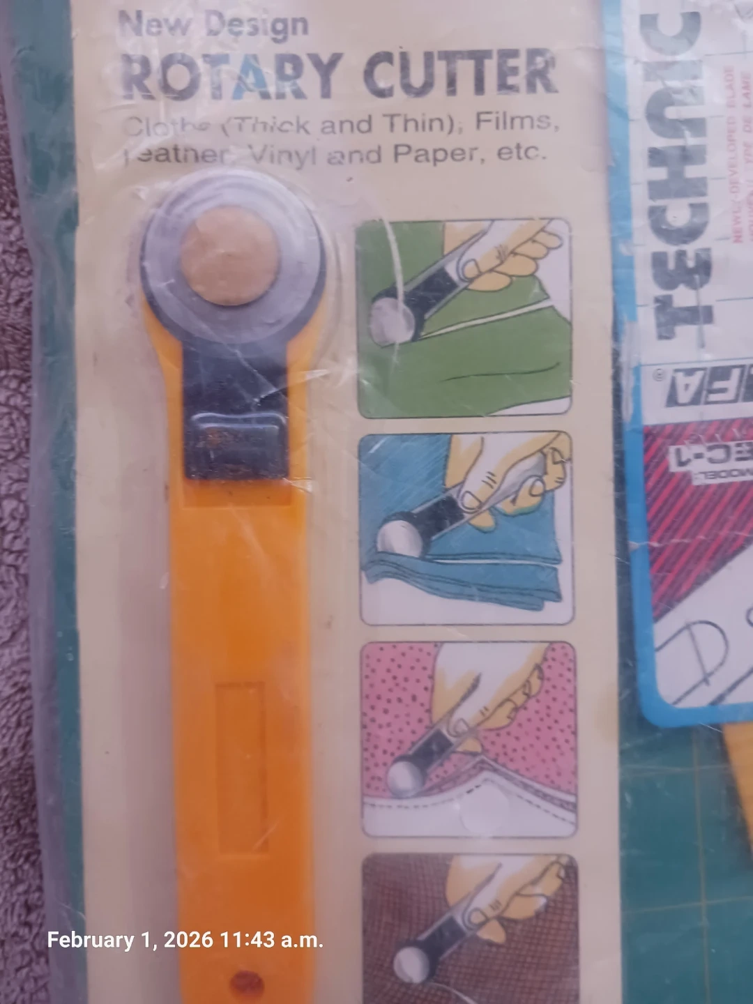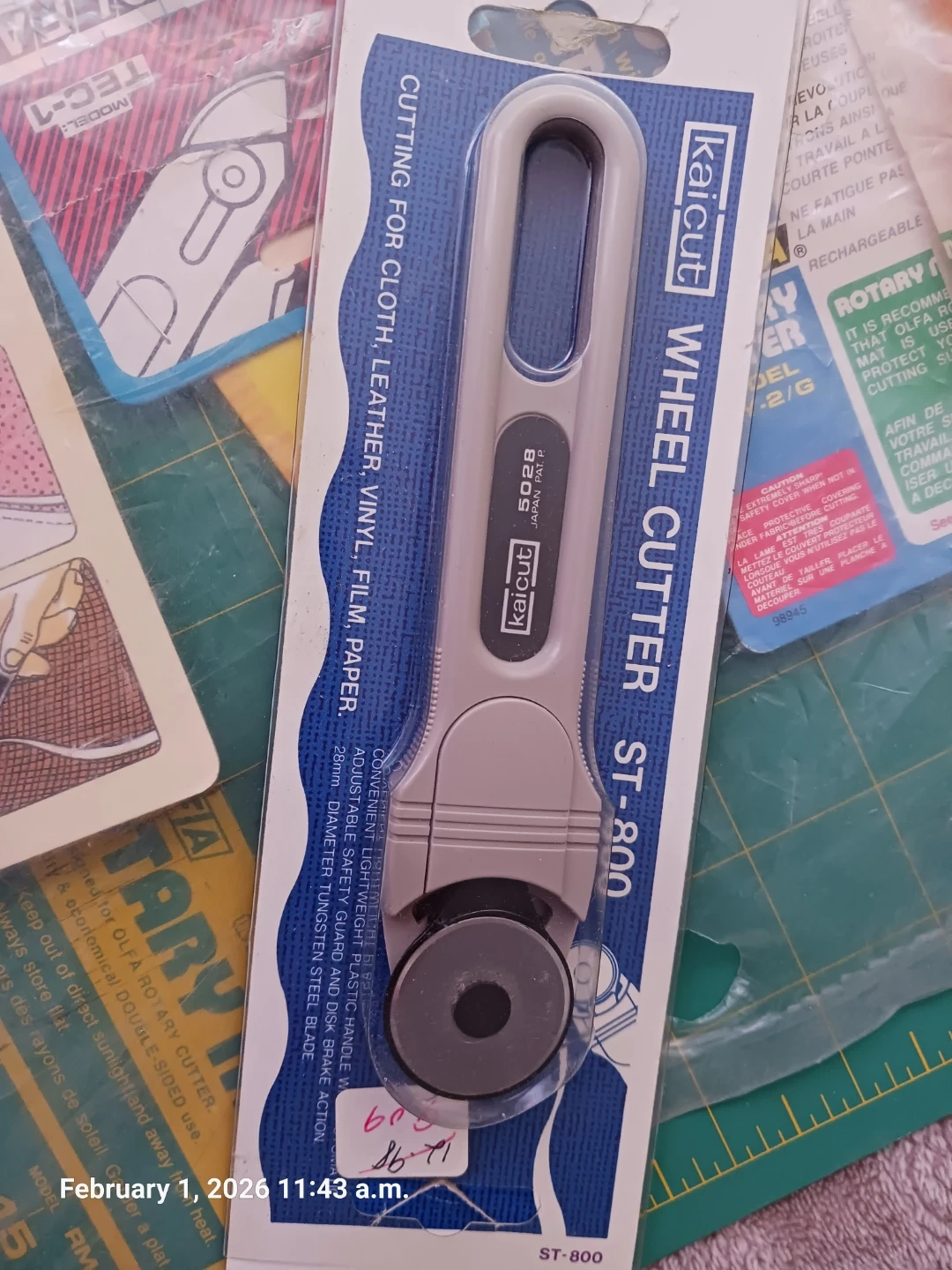 Includes Olfa Rotary Cutter, Kaicut Wheel Cutter ST-800, and a New Design Rotary Cutter. These tools are designed for cutting cloth, leather, vinyl, film, and paper. They offer precision for straight or curved lines.