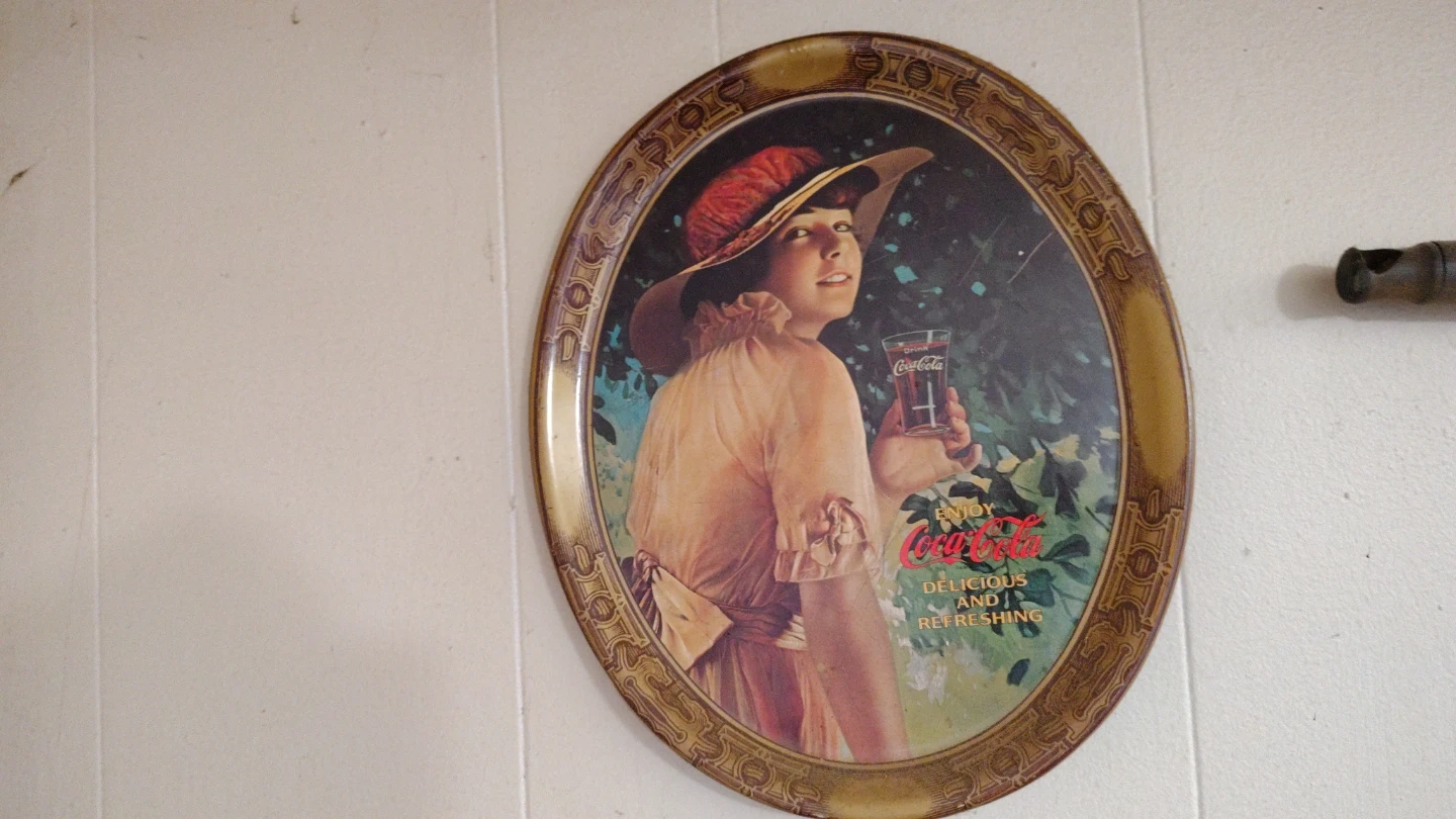 This is a vintage oval Coca-Cola serving tray featuring a classic advertisement with a woman enjoying a drink. It has a decorative embossed gold-tone border. Shows the "Enjoy Coca-Cola Delicious and Refreshing" slogan.