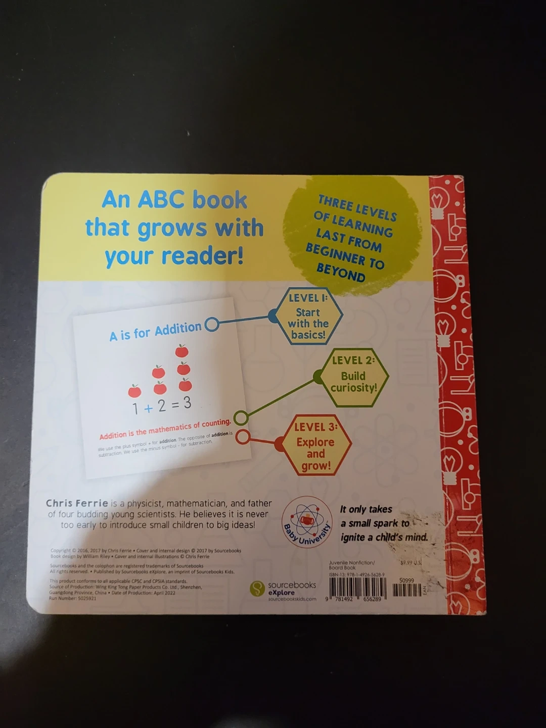 This is the ABC's of Mathematics board book by Chris Ferrie. It's designed to grow with your reader, starting from the basics. It covers three levels of learning, from beginner to beyond. A great way to introduce young minds to big ideas!