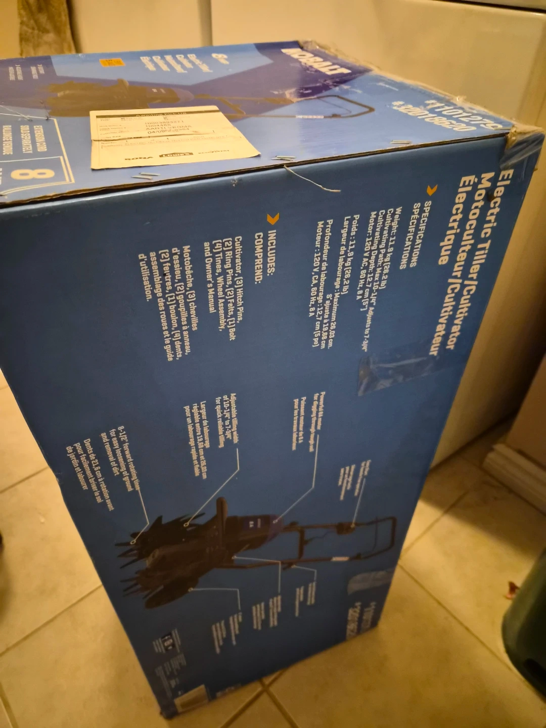Kobalt electric tiller cultivator with an 8 Amp motor. It has a tilling width of 13.5 inches and a tilling depth of 8 inches. Includes wheels, handle assembly, and owner's manual. Only used once last summers