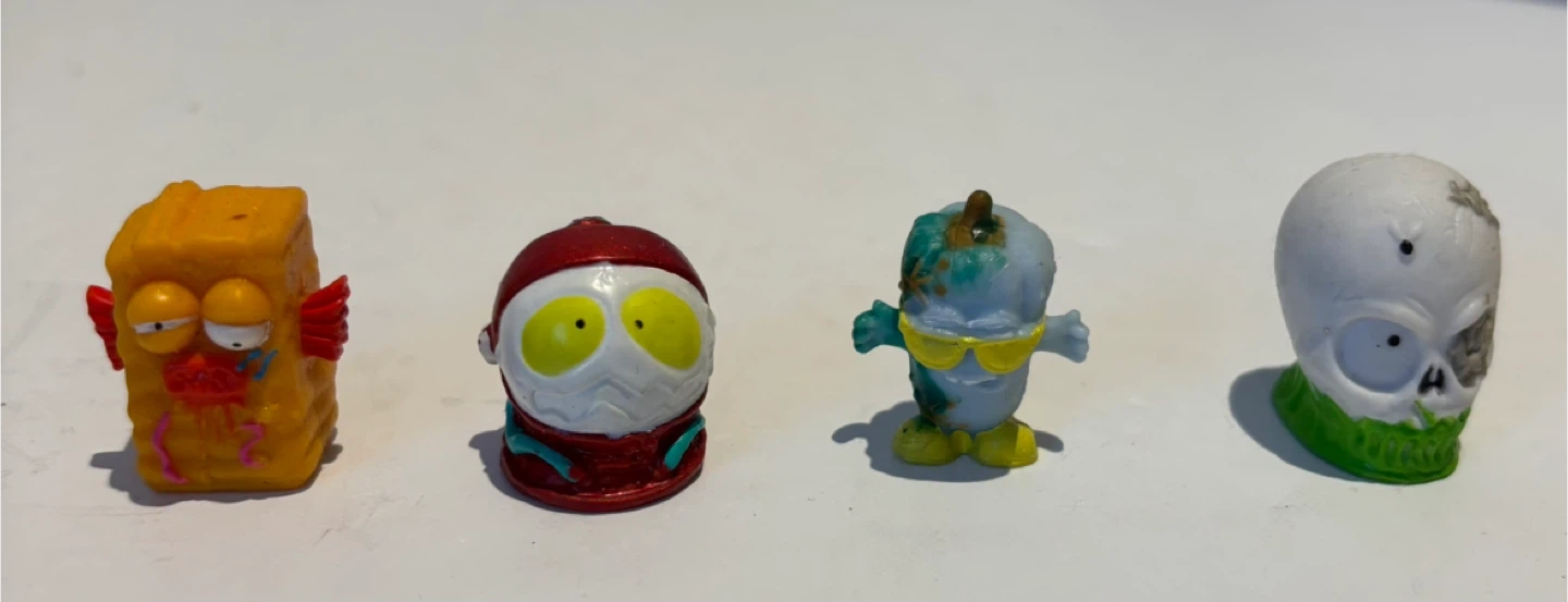 Set of four collectible figurines from The Grossery Gang. Figures include a skull, a character in sunglasses, a boxed character, and a red and white character. Great for adding to your collection!