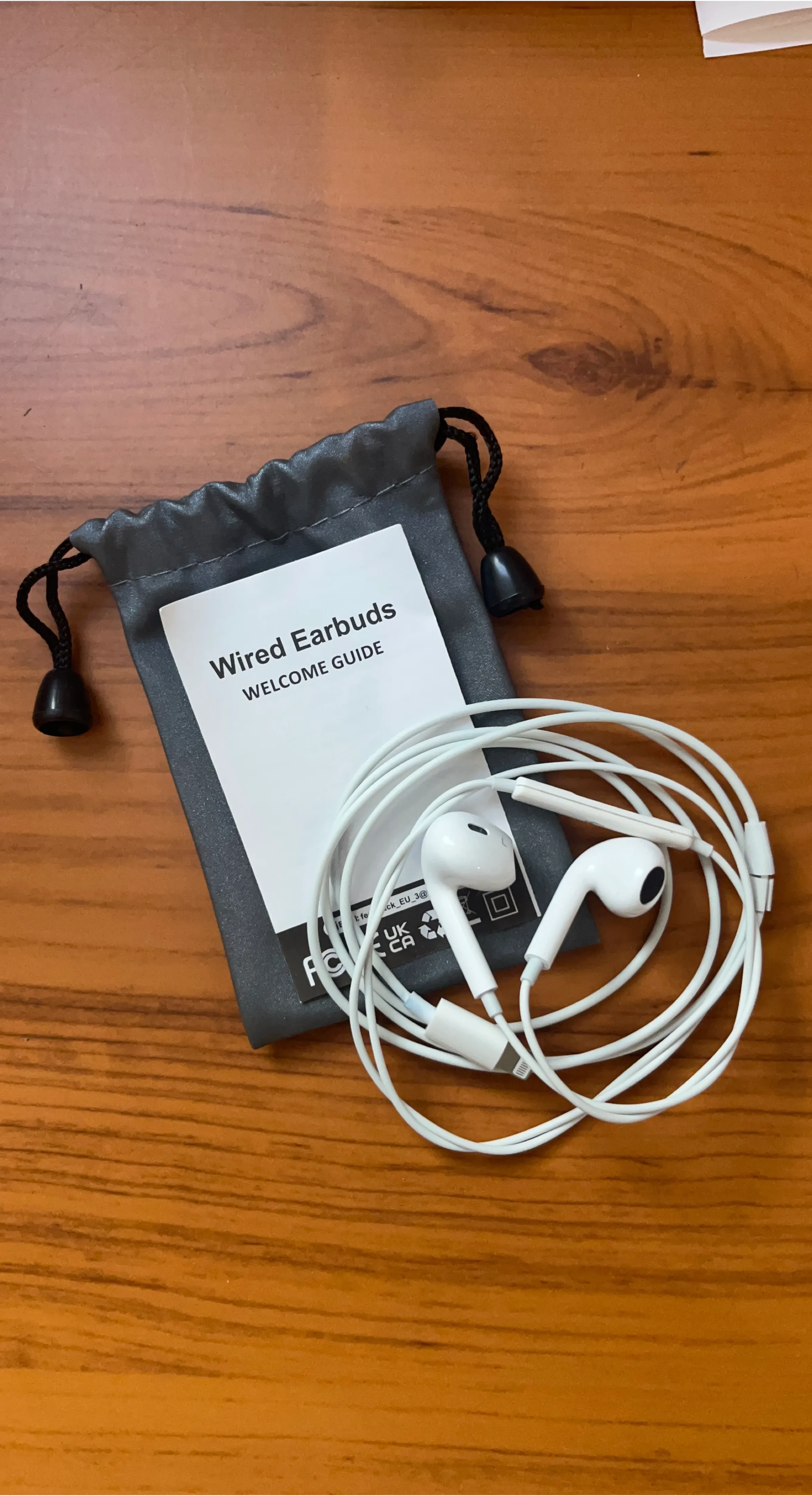 These are white wired earbuds designed with a Lightning connector for compatibility. They come with a small grey drawstring pouch for storage. The earbuds have an in-line remote for controls. These are suitable for devices that use a Lightning port for audio.