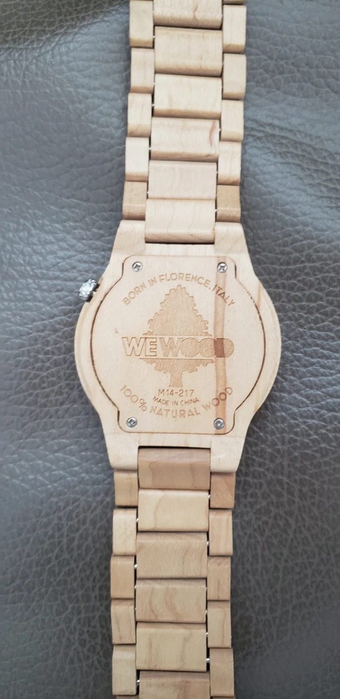 A WEWOOD watch, crafted from 100% natural wood. This timepiece is born in Florence, Italy. Its unique wooden construction offers a distinct style for everyday wear.