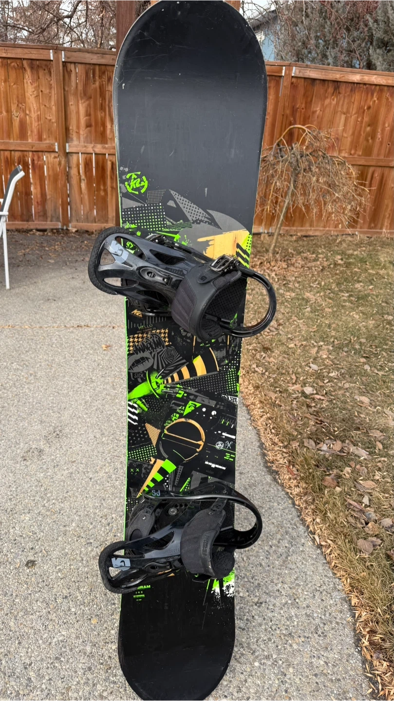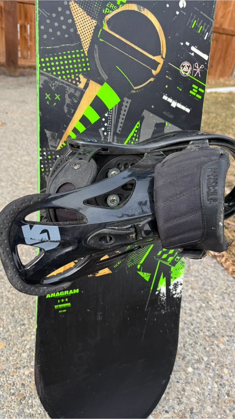 This is a K2 Anagram snowboard, measuring 155cm. It comes with bindings already attached. This board is ready for hitting the slopes!