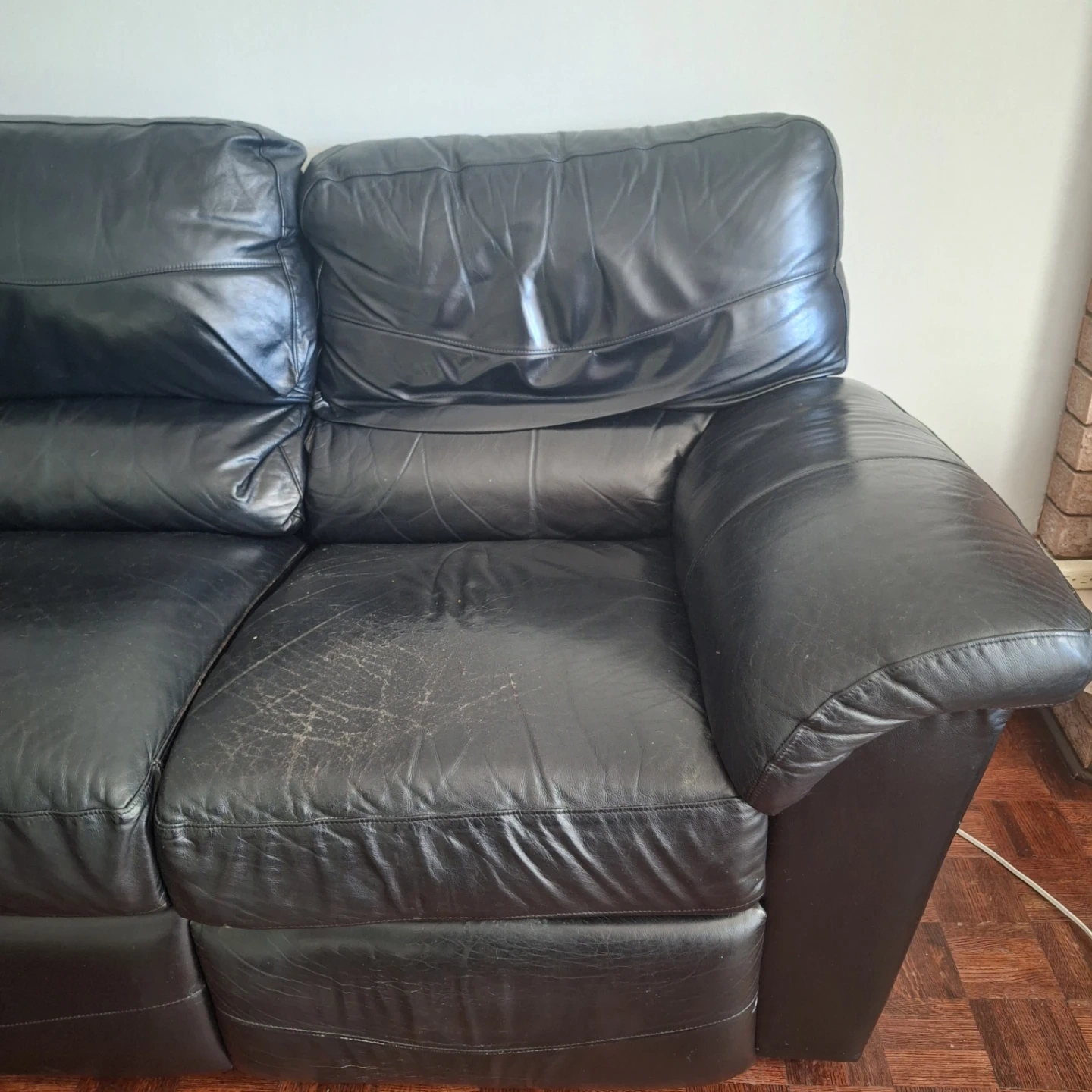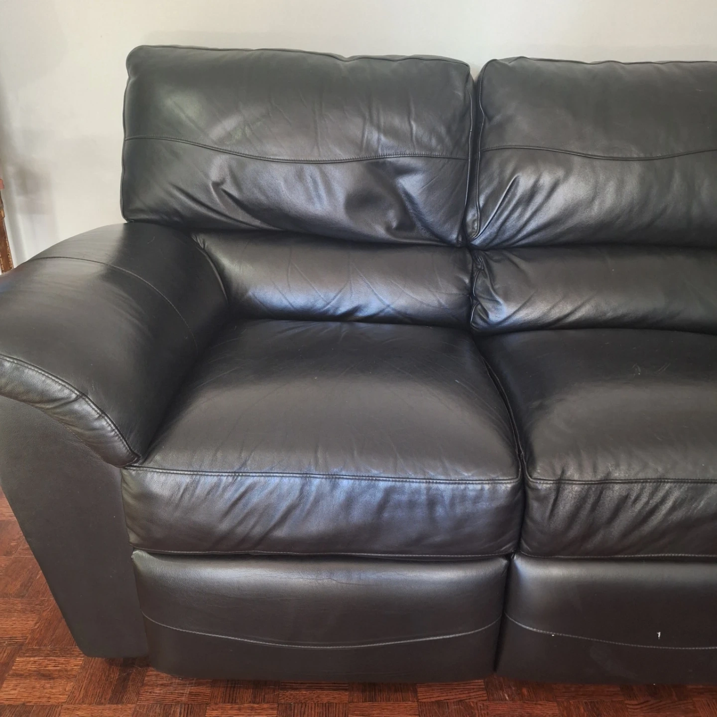 Comfortable, somewhat worn black leather sectional sofa. This spacious piece offers ample seating for 6 for your living/rec room. It's made of durable leather material.