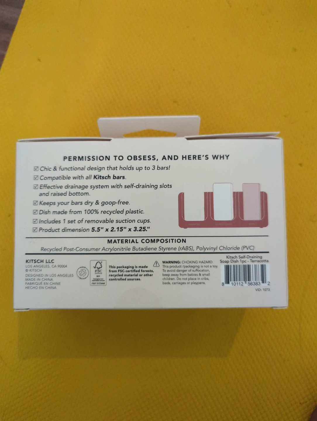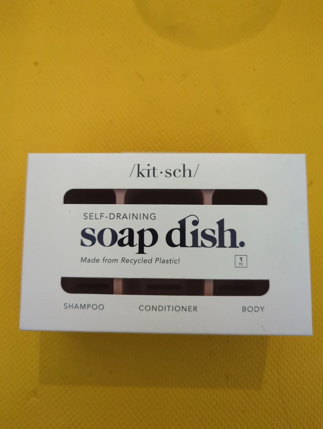 This Kitsch self-draining soap dish is made from recycled plastic. It's compatible with Kitsch bars and keeps them dry. The dish includes 1 set of removable suction cups.