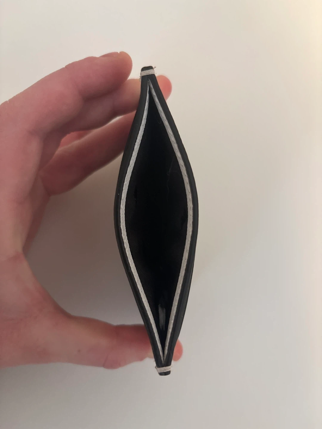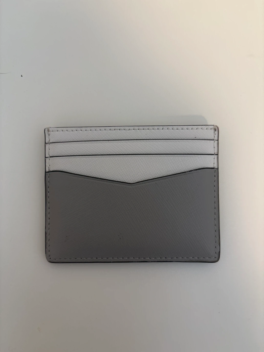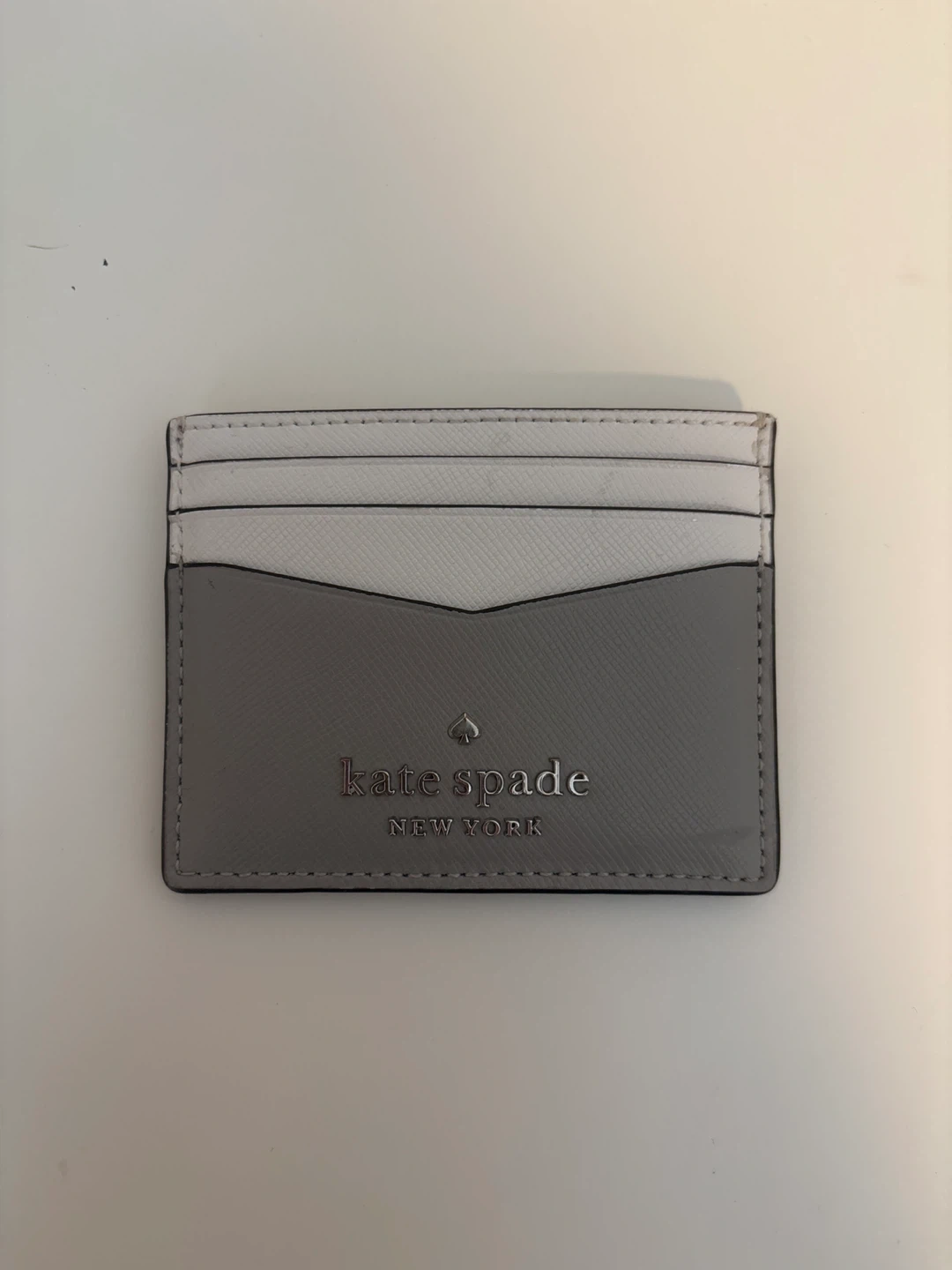 This Kate Spade card holder is grey and white with multiple card slots. It's made of leather. A simple way to carry your essentials!