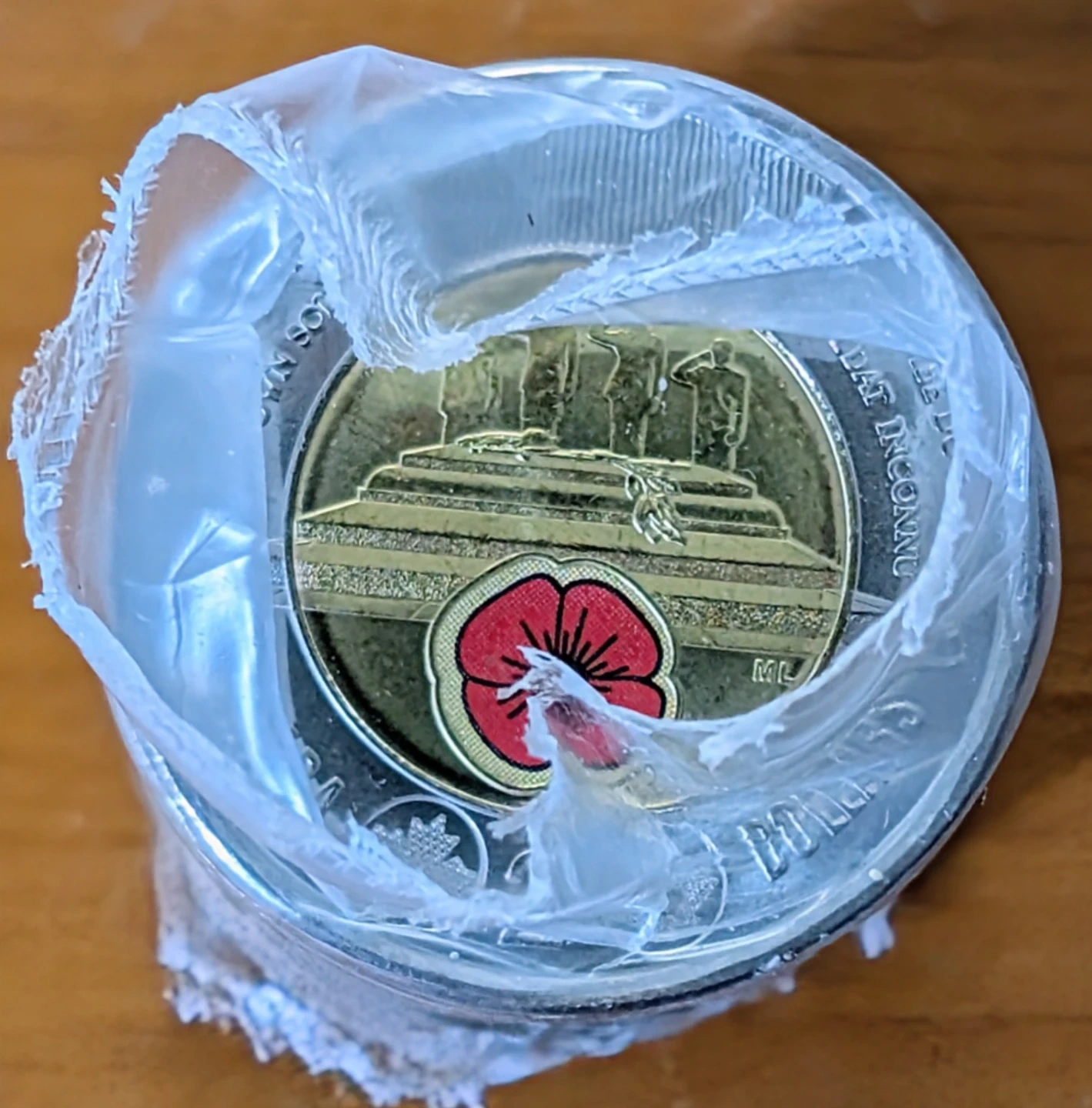 Canada 2 dollar coins featuring the Remembrance Day poppy design.