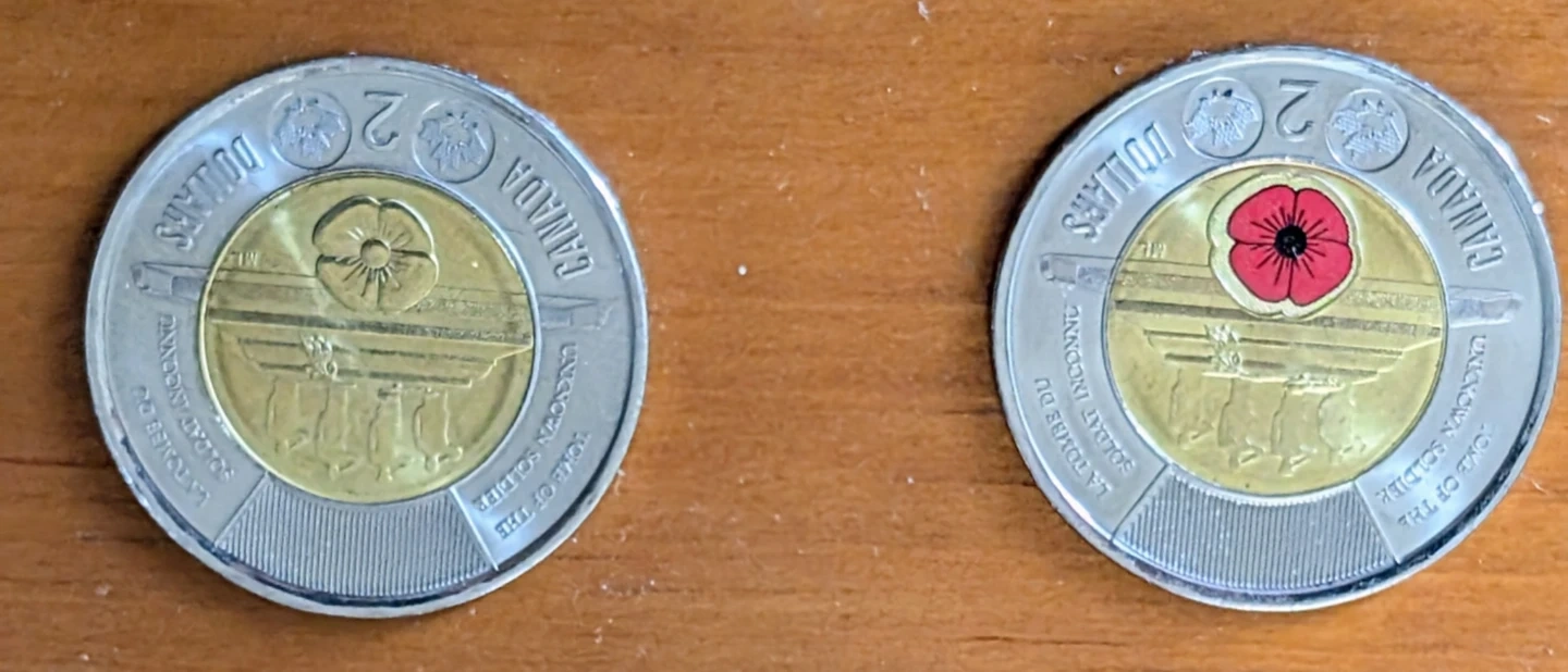 Canada 2 dollar coins featuring the Remembrance Day poppy design.