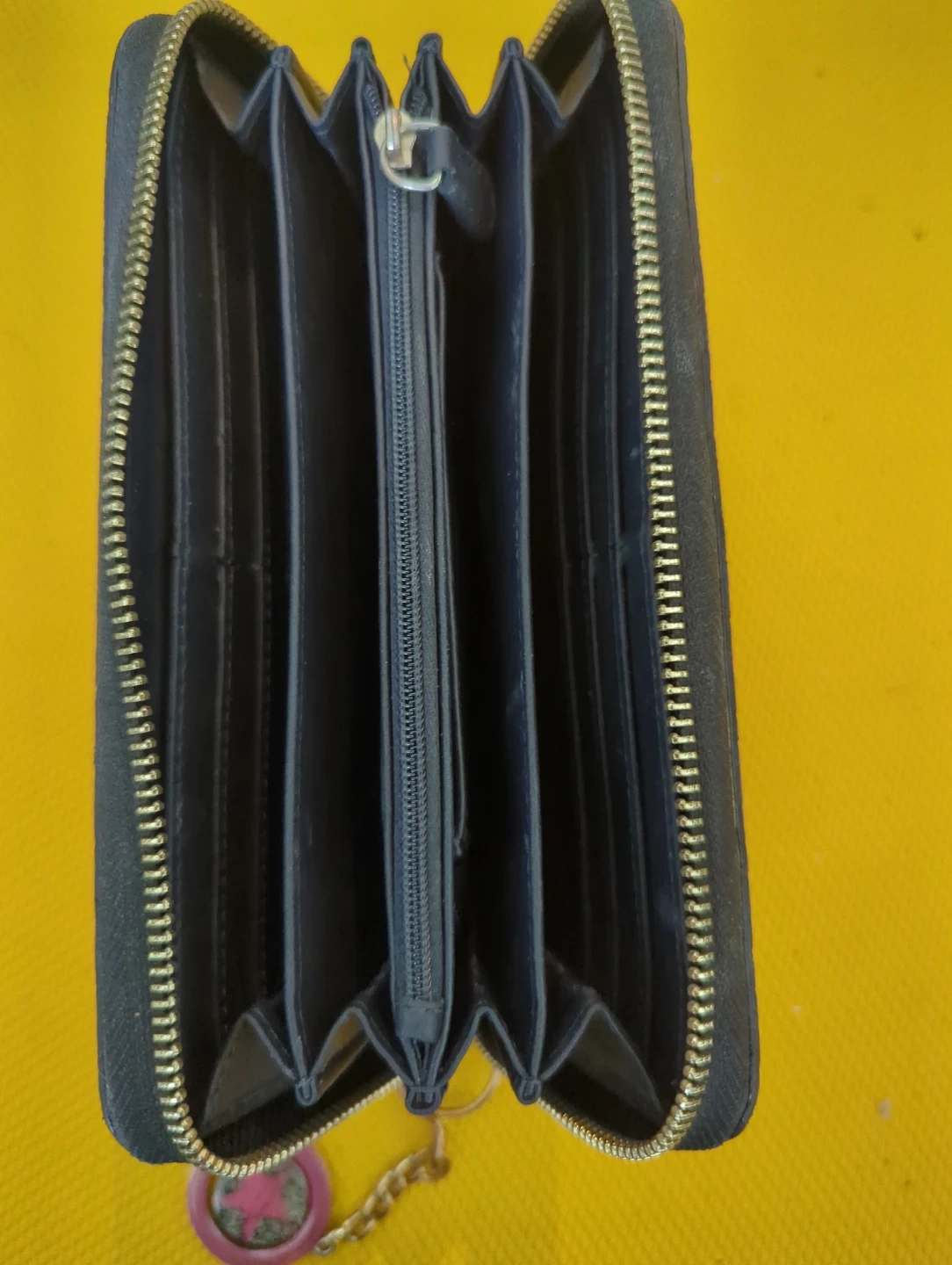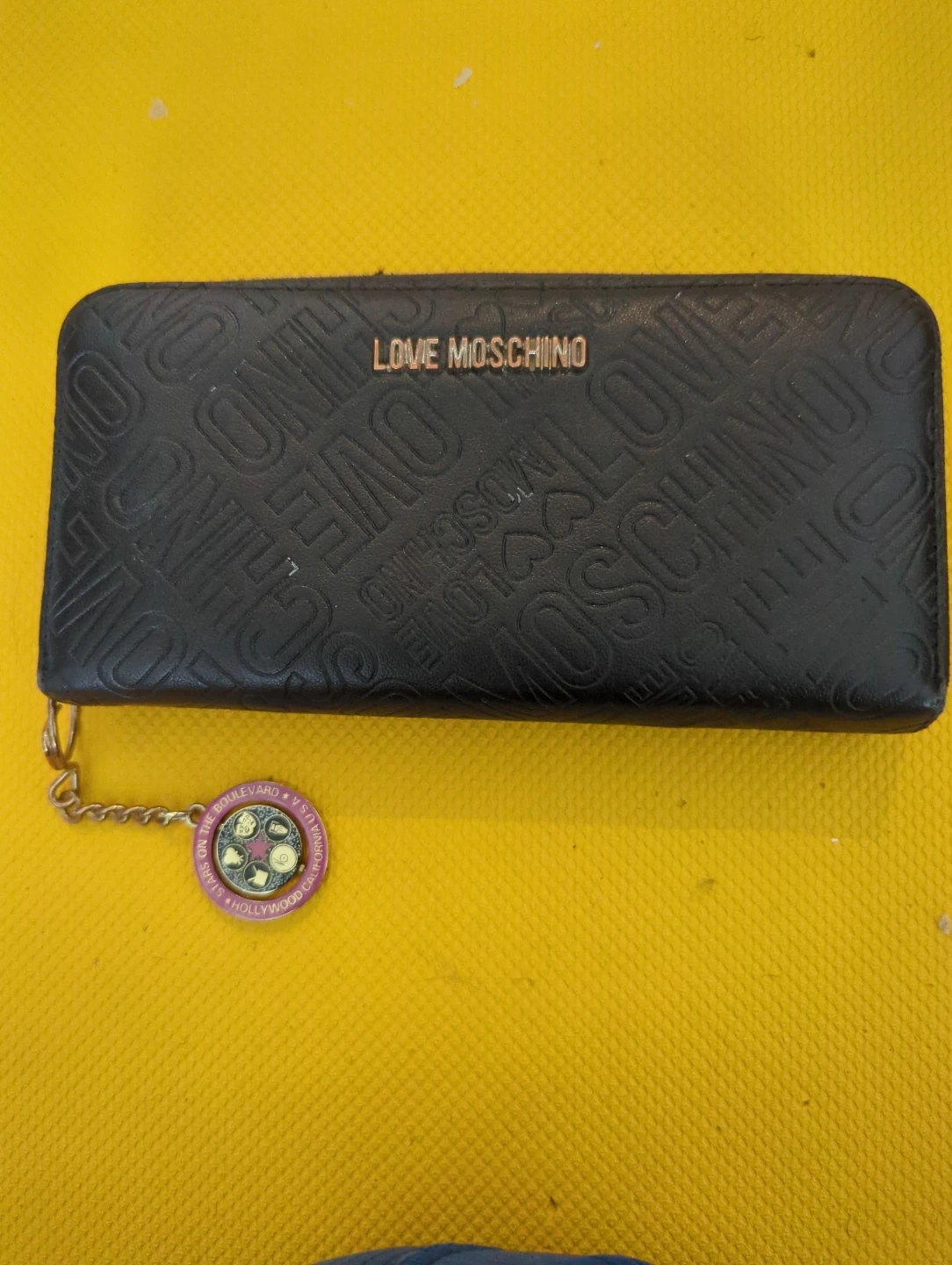 This is a black Love Moschino zip-around wallet. It's made from faux leather with an all-over logo print. The interior has multiple compartments for cards and cash. It's a stylish accessory for everyday use!