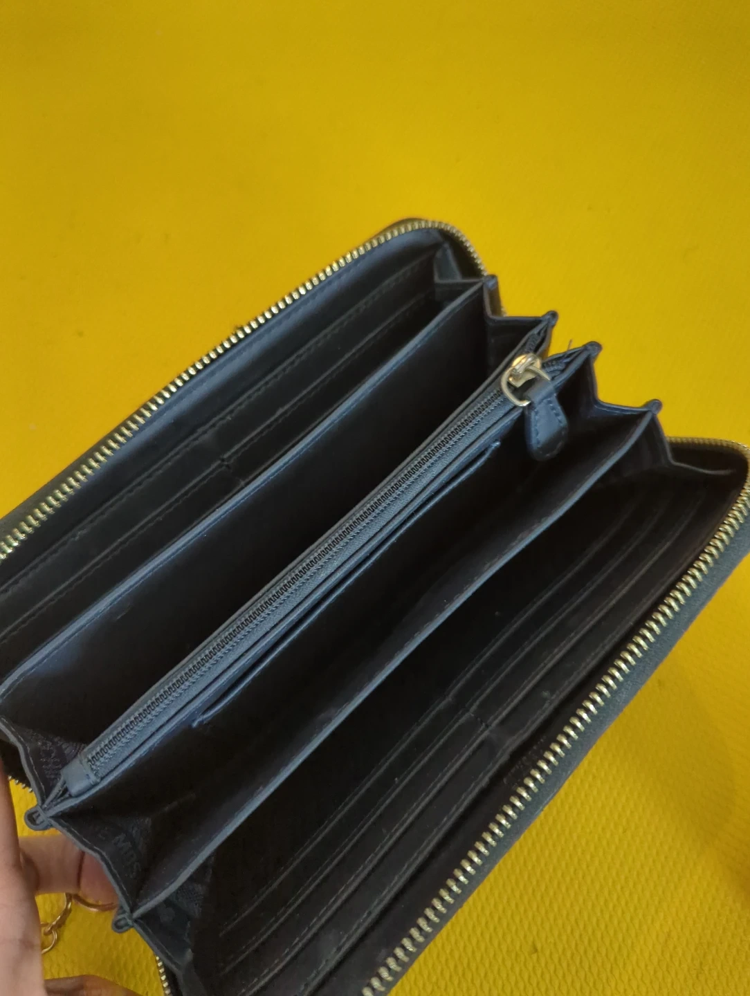 This is a black Love Moschino zip-around wallet. It's made from faux leather with an all-over logo print. The interior has multiple compartments for cards and cash. It's a stylish accessory for everyday use!