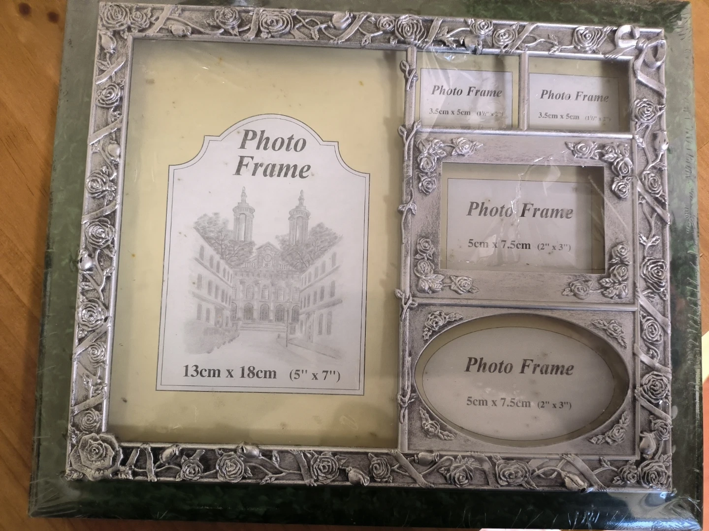 This multi photo frame features an ornate rose design around the edges. It holds one large photo measuring 13cm x 18cm (5" x 7"). There are also four smaller photo openings included. Display your favourite memories!