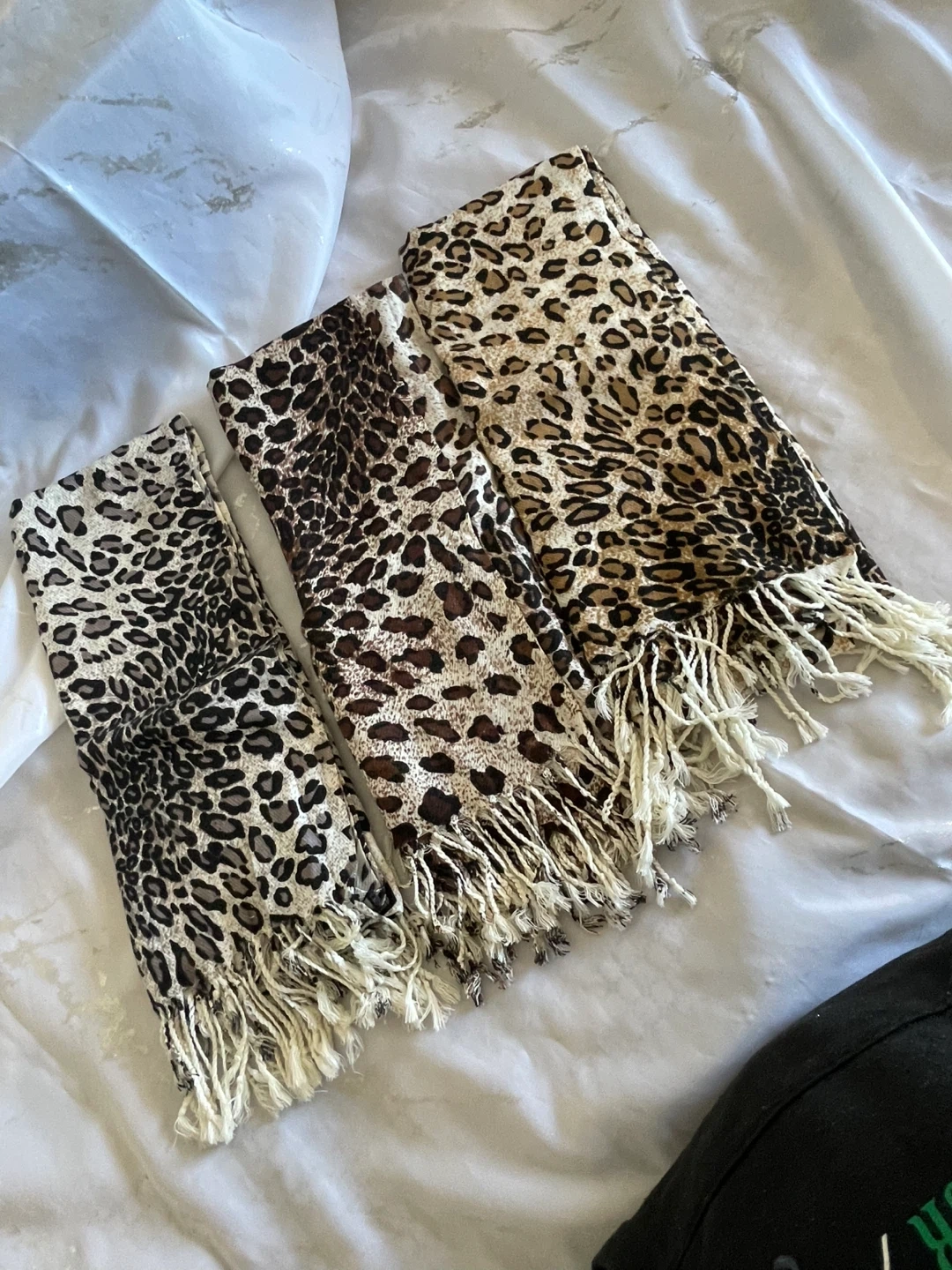 A stylish leopard print scarf featuring a fringe hem. It's a nice accessory for any outfit. This scarf measures about 180 cm long and 70 wide. The cheetah print one has been used once but the other two has never been used. Asking $15 for all three or $5.00 each
