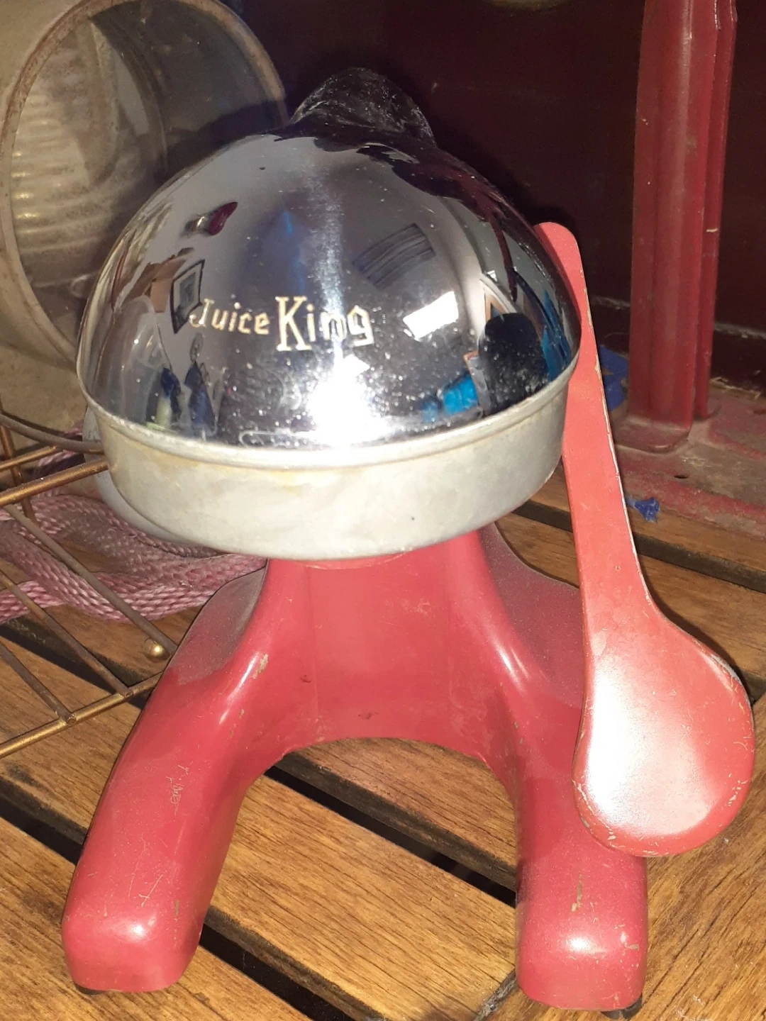 This is a Juice King juicer. It features a chrome dome and a red base. It includes a lever for pressing vintage.
