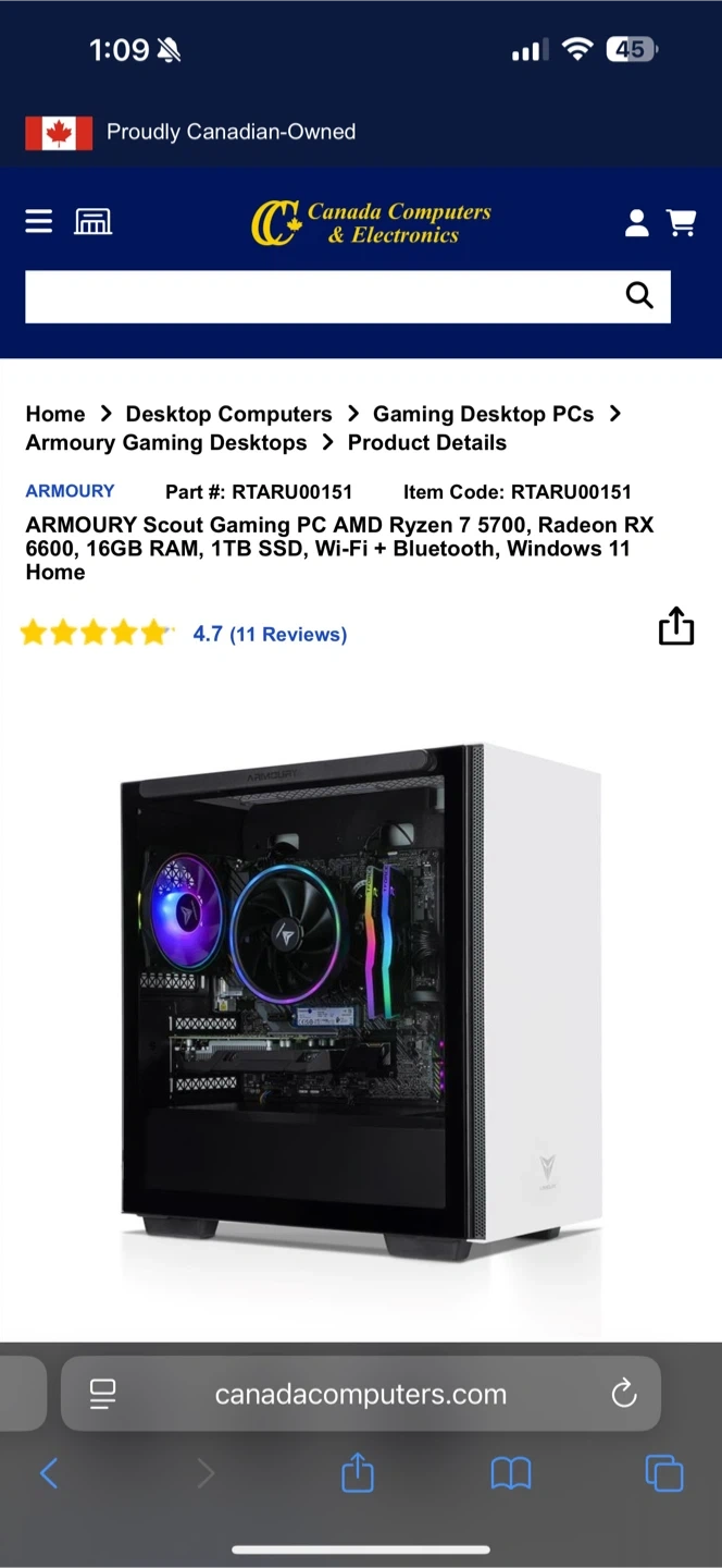 ARMOURY Scout A-150 gaming PC. It's a mini tower with an AMD Ryzen 7 5700 CPU and NVIDIA GeForce RTX 3050 GPU. Includes 16GB DDR4 RAM and a 1TB SSD. Runs on Windows 11 Home with Wi-Fi + Bluetooth.
