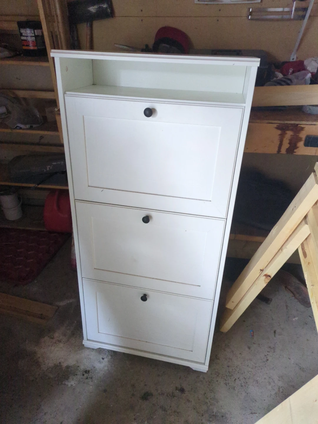 This white 3-tier shoe cabinet offers convenient storage with its flip-down drawers. It's a practical piece for organizing footwear.