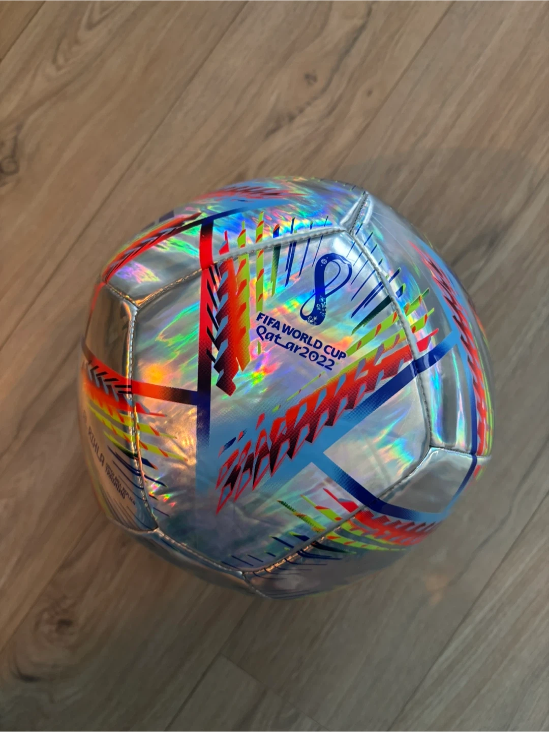 This is the official FIFA World Cup Qatar 2022 soccer ball. It features a holographic, multi-coloured design. The ball is constructed for durability and performance.