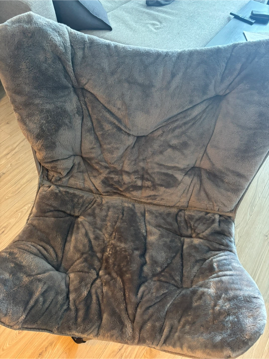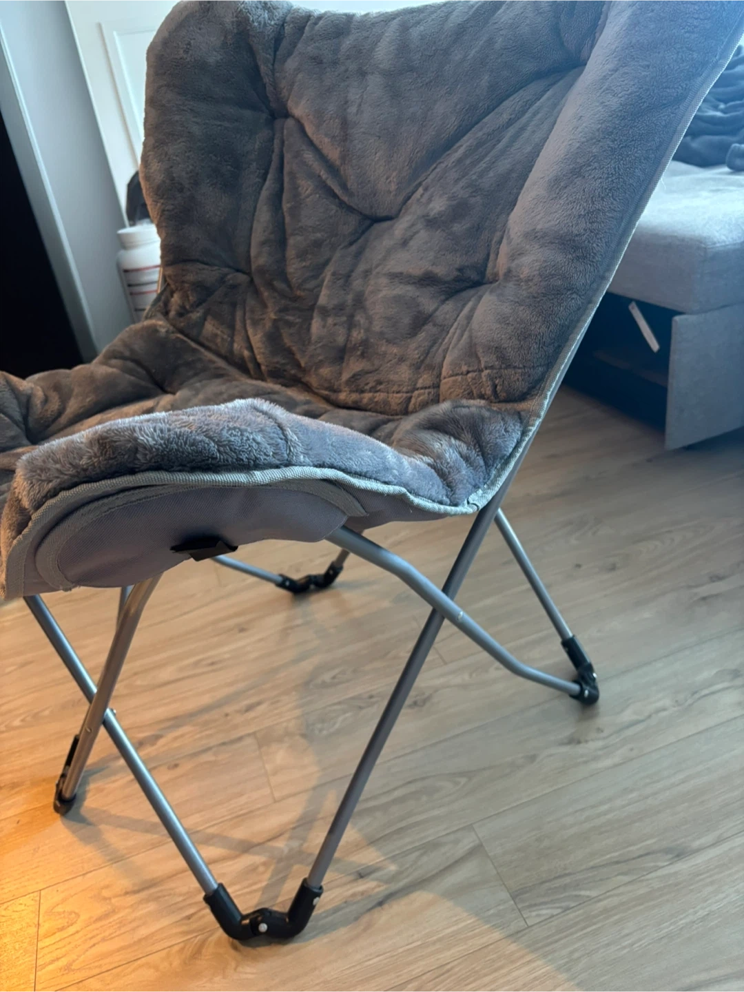 This comfy butterfly chair has a soft grey faux fur cover. It's a great accent chair for any room. The chair has a sturdy metal frame and folds for easy storage.