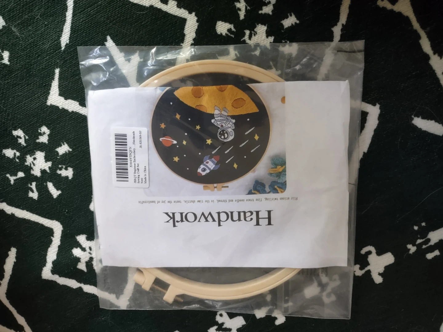 This beginner embroidery set features a fun astronaut and rocket design. It includes everything needed to start a new craft. Perfect for anyone looking to try embroidery!