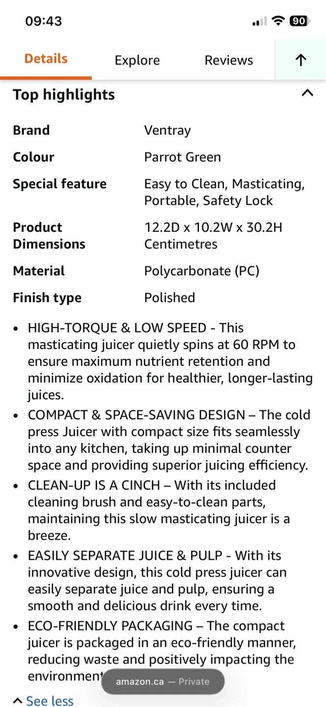 This Ventray cold press juicer is Parrot Green. It's a masticating juicer that spins at 60 RPM. It comes with a cleaning brush and is easy to clean. Great for making healthy juices!