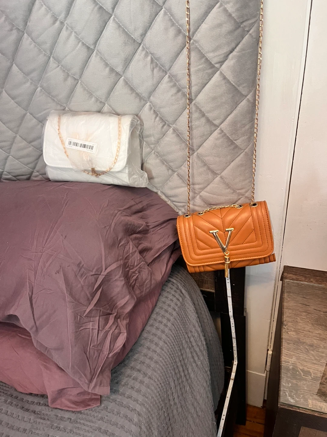 This is an orange shoulder bag with a "V" emblem. It features a quilted design and a gold-tone chain strap. The bag is made of faux leather. I have 1 brown one left and 2 white ones left..they r brand new, never been used.